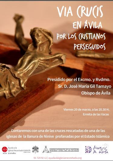 Ayuda a la Iglesia Necesitada invita a la comunidad diocesana a participar en el Vía Crucis por los cristianos perseguidos, que tendrá lugar el 20 de marzo, a las 20.30 hs en la Ermita de Nuestra Señora de Las Vacas, presidido por el obispo de Ávila, Mons. José María Gil Tamayo. Con él, queremos recordar a todos los cristianos, en especial, en este tiempo litúrgico de Cuaresma, la situación de persecución o falta de libertad que sufren muchos hermanos en la fe en diversas zonas del mundo.