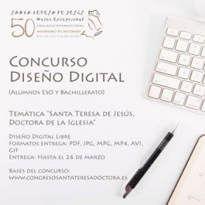 El concurso de diseño digital está destinado a alumnos que cursen Educación Segundaria Obligatoria o Bachillerato mediante un diseño digital libre (Collage, vídeo, eslogan, carteles, montaje de fotos, de vídeos o de imágenes, cortometraje, etc.) sobre la temática de “Santa Teresa de Jesús, Doctora de la Iglesia”. El formato de entrega será en PDF, JPG, MPG, MP4, AVI, GIF o facilitando un enlace de entrada al material creado. El primer premio será galardonado con una Tablet; mientras que el segundo, con un reloj inteligente.