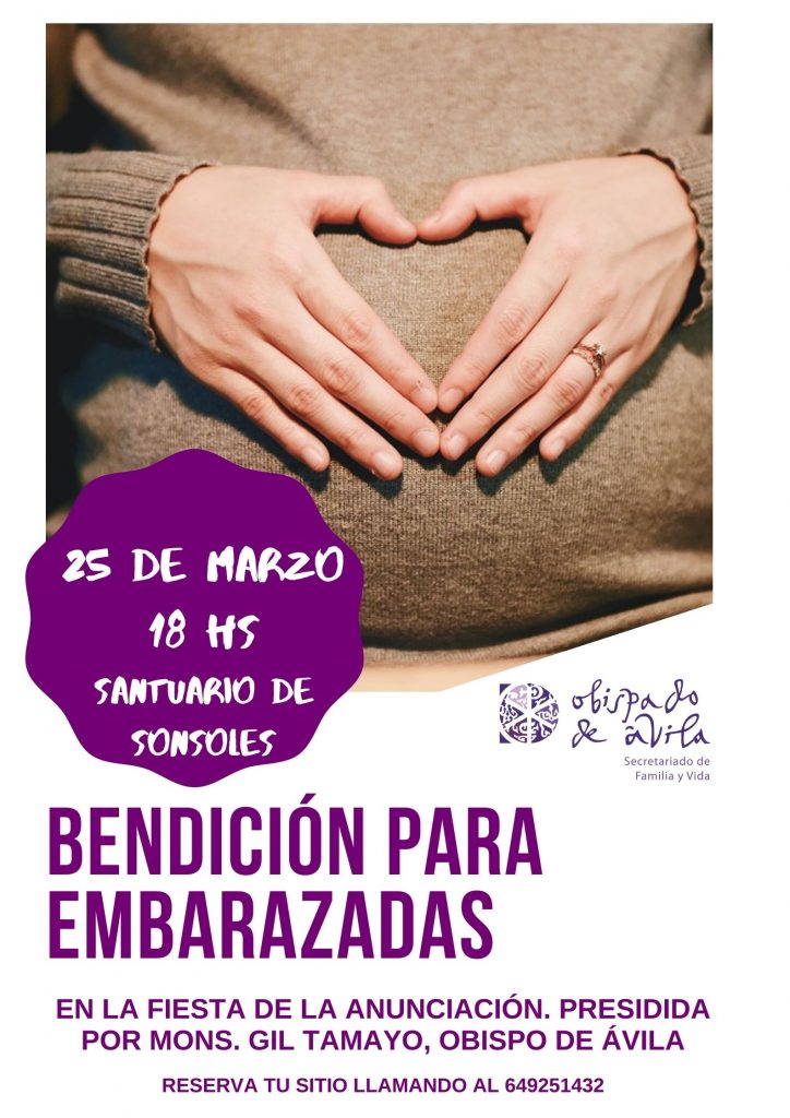 El Obispo de Ávila, Mons. José María Gil Tamayo, presidirá el próximo jueves 25 de marzo una Eucaristía en el Santuario Diocesano de Nuestra Señora de Sonsoles a las 18 hs, en la que bendecirá a las mujeres embarazadas de la diócesis que deseen acudir. Para ello, y debido a las restricciones de aforo por la situación sanitaria, es necesario que reserven previamente su sitio, llamando al 649251432.