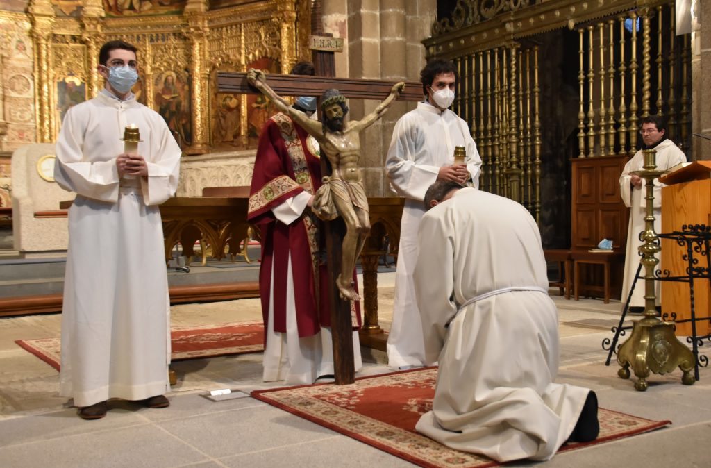Con el altar desnudo. Sin luz. Con la postración inicial del obispo frente a él. Así comenzaban un año más los oficios de Viernes Santo en la Catedral de Ávila. Una liturgia sobria, con la que se ha conmemorado el misterio de la Pasión de Cristo.