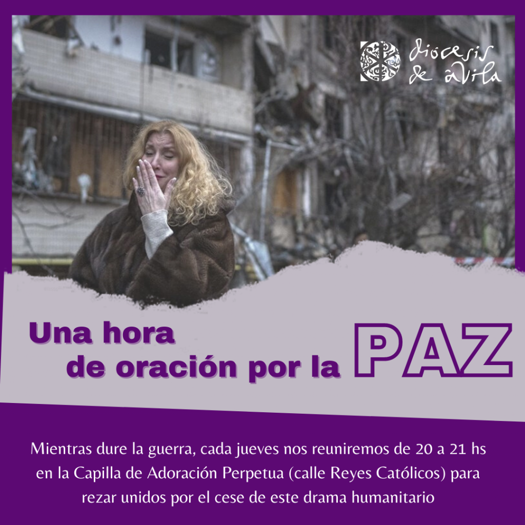Con este motivo, la diócesis de Ávila invita a todos los fieles cada jueves, de 20 a 21 horas, a compartir “Una hora de oración por la paz”. Esta oración, que ya comienza esta misma tarde/noche, se celebrará en la Capilla de Adoración Perpetua (calle Reyes Católicos), y se mantendrá cada jueves, hasta que cese la guerra.