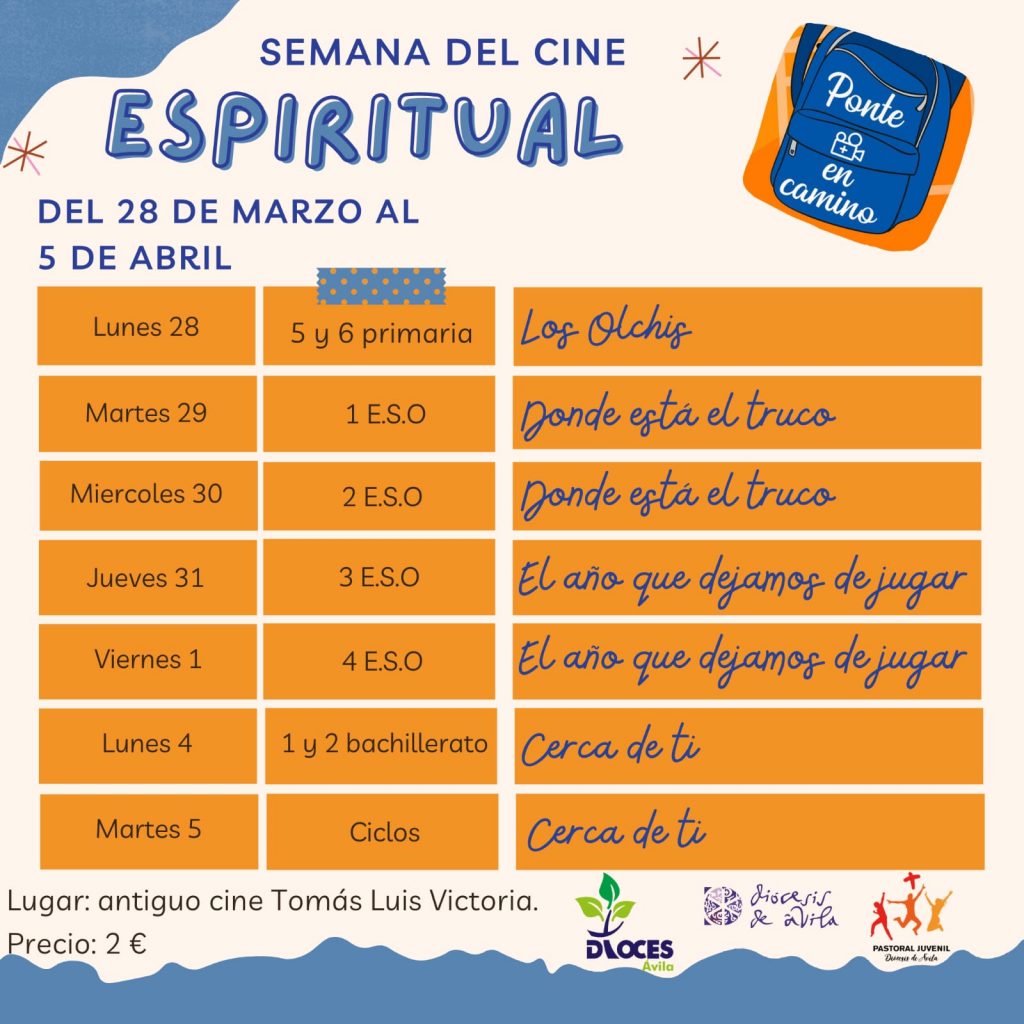 La próxima semana comenzará una nueva edición de la Semana de Cine Espiritual. Es una iniciativa de la Subcomisión de Juventud e Infancia de la Conferencia Episcopal Española, dirigida a niños, adolescentes y jóvenes. Es coordinada con las delegaciones diocesanas de Juventud (Delegación Juventud Diócesis de Ávila) en comunión con Escuelas Católicas y, en nuestra Diócesis de Ávila, con los Colegios Diocesanos.