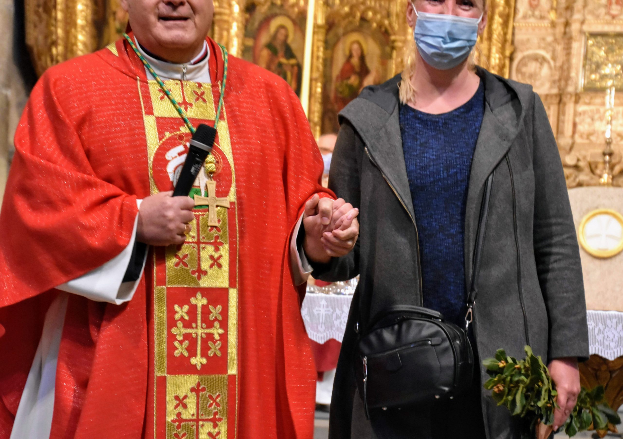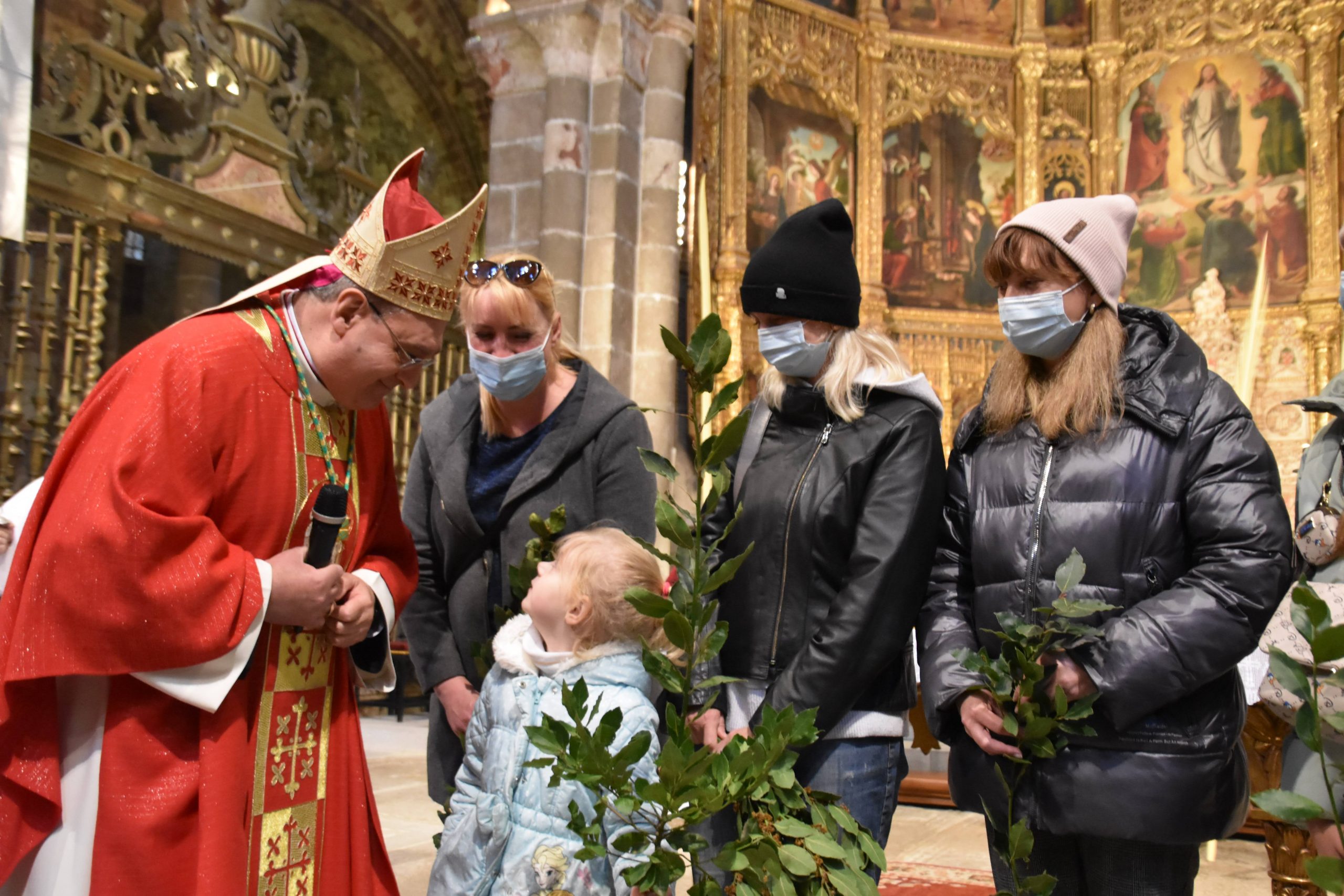 La guerra de Ucrania también ha estado muy presente en la celebración. «Vosotros veis en la tele las escenas de esos otros niños que salen de Ucrania huyendo del horror de la guerra», se dirigía D. José María a los pequeños que ocupaban los primeros bancos. «Vienen huyendo de otra pasión. Pero no dudéis de que Jesús se hace presente con los que sufren». Una intención que se repitió m´´as tarde, en el momento de rezar el Padre Nuestro, cuando el obispo pedía de nuevo a los niños que oraran por los pequeños ucranianos. Pero el momento más emotivo de la celebración se produjo al final de la misma, cuando alguien indicó a D. José María que un grupo de refugiados ucranianos, muchos de ellos niños, estaban participando de la Eucaristía. El obispo quiso invitarlos a subir al altar, momento en el que los fieles irrumpieron en un aplauso lleno de cariño. «Esta es la verdadera acogida fraterna de los hijos de Dios, que huyen de una guerra cruel e injusta contra un pueblo que sufre», afirmaba el obispo justo antes de bendecirlos a ellos y a todos los asistentes.