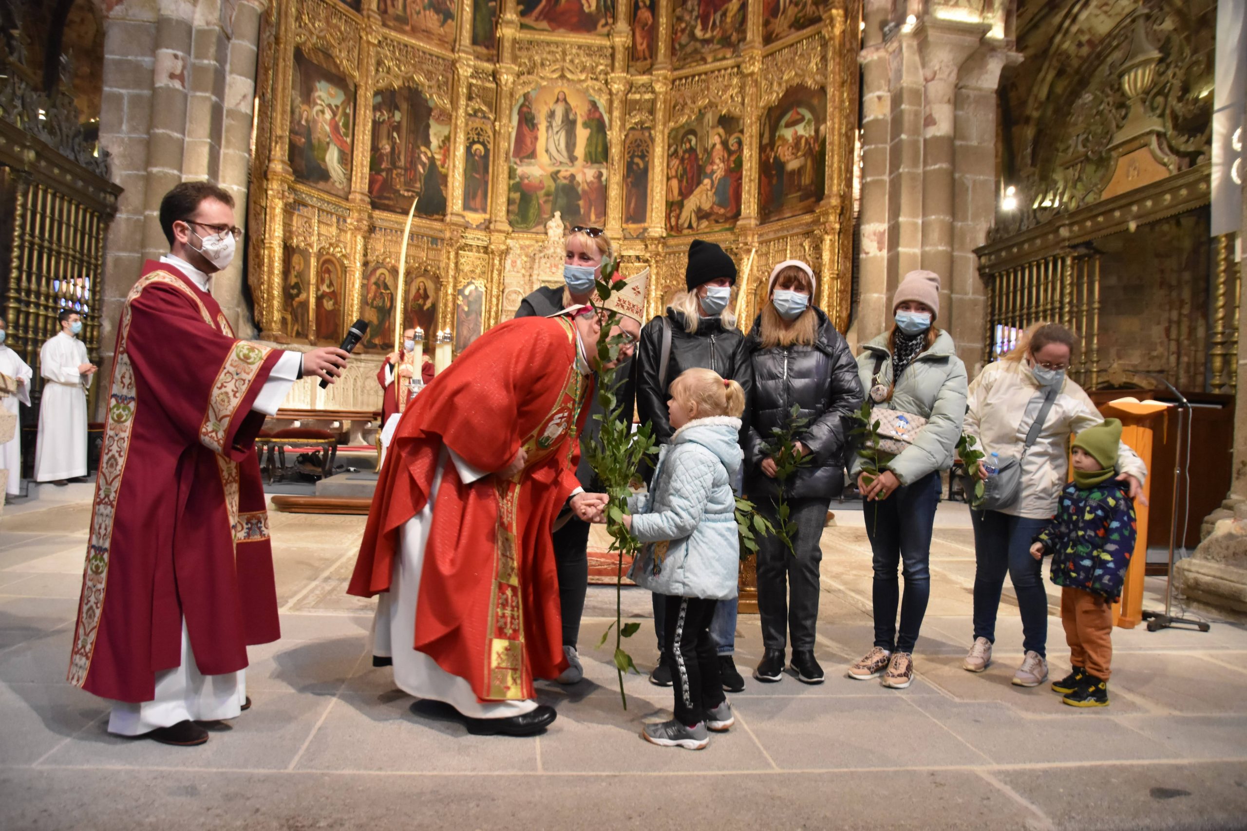 Los niños y los mayores celebraban juntos la conmemoración de la entrada de Jesús en Jerusalén. «Un momento de gloria, en el que se reconoce a Cristo como el Mesías prometido. Pero ese momento de reconocimiento duraría poco», destacaba Mons. Gil Tamayo en su homilía. El prelado abulense destacaba cómo, a pesar de esos momentos de Pasión que se vivirían después, «Cristo ha triunfado y ha vencido al pecado y a la muerte, abajándose, haciéndose uno de nosotros, en una entrega generosa, sin límites, por amor».