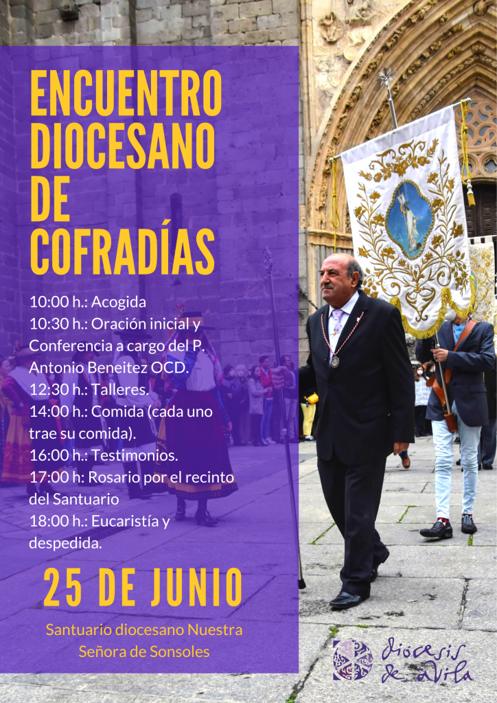 El encuentro se desarrollará el sábado 25 de junio en el Santuario diocesano de Nuestra Señora de Sonsoles. La jornada comenzará con la acogida a las 10 hs, para dar paso a una oración y a la conferencia del carmelita P. Antonio Beneitez OCD. Tras ella, a las 12:30 hs comenzarán diferentes talleres hasta la comida a las 14 hs (cada participante llevará su propia comida). Después de este descanso, a las 16 hs se podrán escuchar diferentes testimonios de cofrades, y rezaremos juntos el Rosario por el recinto del Santuario. El encuentro concluirá con la Eucaristía en el Santuario a las 18 hs.