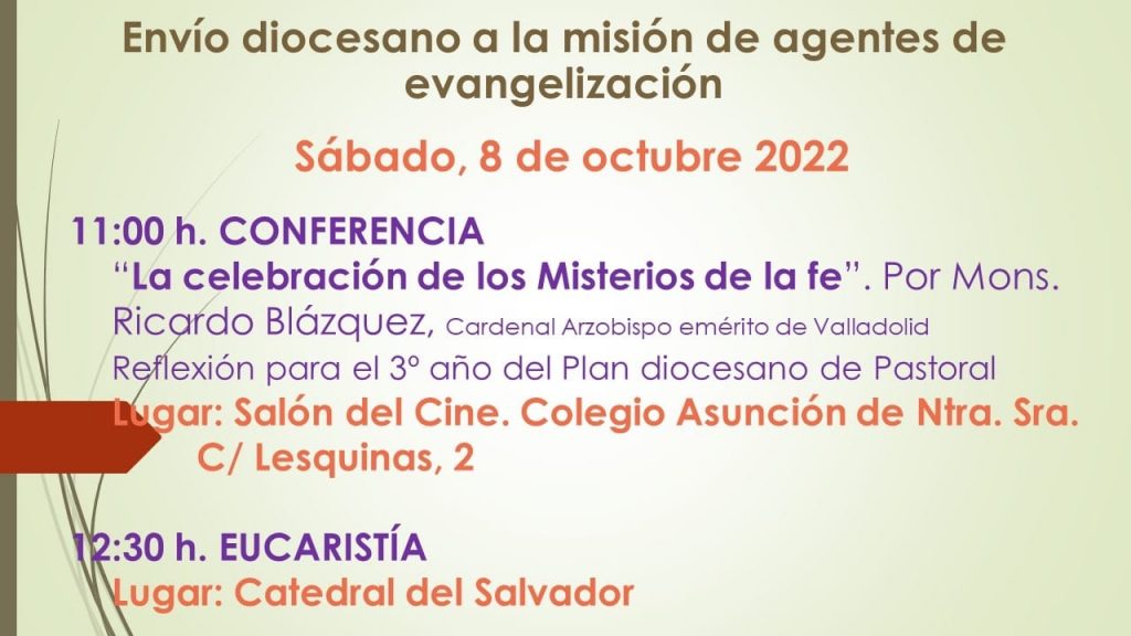 Antes, a las 11 horas, hay programada una conferencia en el Colegio diocesano “Asunción de Nuestra Señora”, a cargo del Cardenal D. Ricardo Blázquez sobre “La celebración de los Misterios de la fe”. Esta ponencia servirá como reflexión y punto de partida del tercer punto del Plan diocesano de Pastoral, que trabajaremos en este curso.