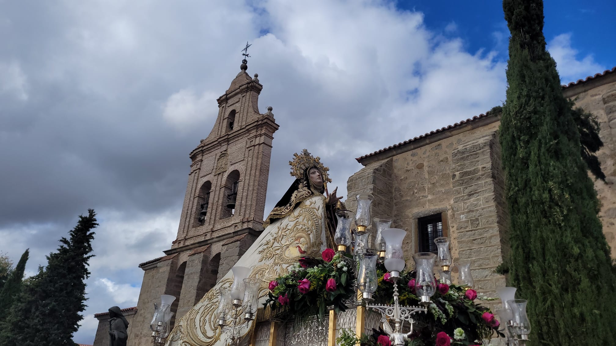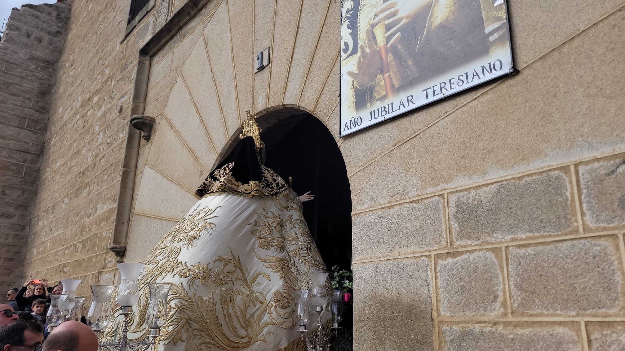 Atravesando la puerta del Carmen de la muralla abulense, bajaba pasado el mediodía Santa Teresa, acompañada por numerosos fieles, rumbo al monasterio de madres carmelitas, que repicaba felizmente su campanilla nada más vislumbrar la imagen de Teresa a lo lejos. Nada más atravesar la puerta de la iglesia, bajo los sones del Himno de España, los fieles irrumpían en sonoros aplausos. También las hermanas, que desde las rejas de su clausura se asomaban con sonrisas de felicidad para dar la bienvenida a la Madre Teresa. Y allí, en el altar, junto a la imagen de la Virgen de la Clemencia (que habitualmente está en la clausura, y a la que Santa Teresa, cuando vino de priora a La Encarnación, le puso las llaves del convento) era colocada por los anderos cerca ya de las 14:30 de este martes festivo.