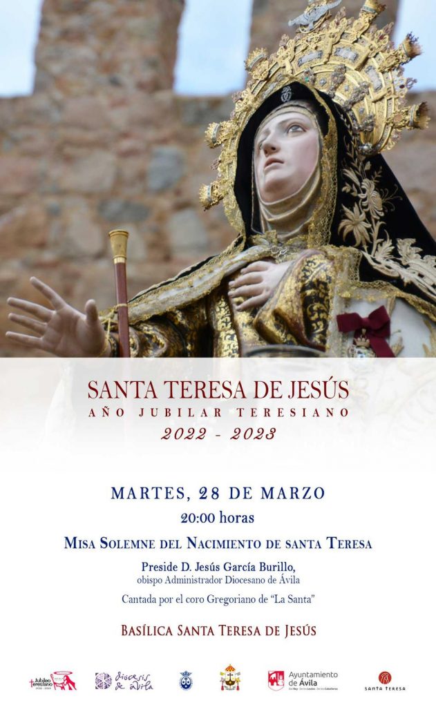 En este Año Jubilar Teresiano que estamos celebrando en nuestra diócesis, esta fecha del nacimiento de Santa Teresa cobra un carácter especial. Con este motivo, está prevista la celebración de una Misa Solemne en la Basílica de la Santa este citado martes 28 de marzo a partir de las 20 horas. Estará presidida por el Administrador Diocesano de Ávila, Mons. Jesús García Burillo, y contará con el acompañamiento musical del Coro Gregoriano de La Santa.