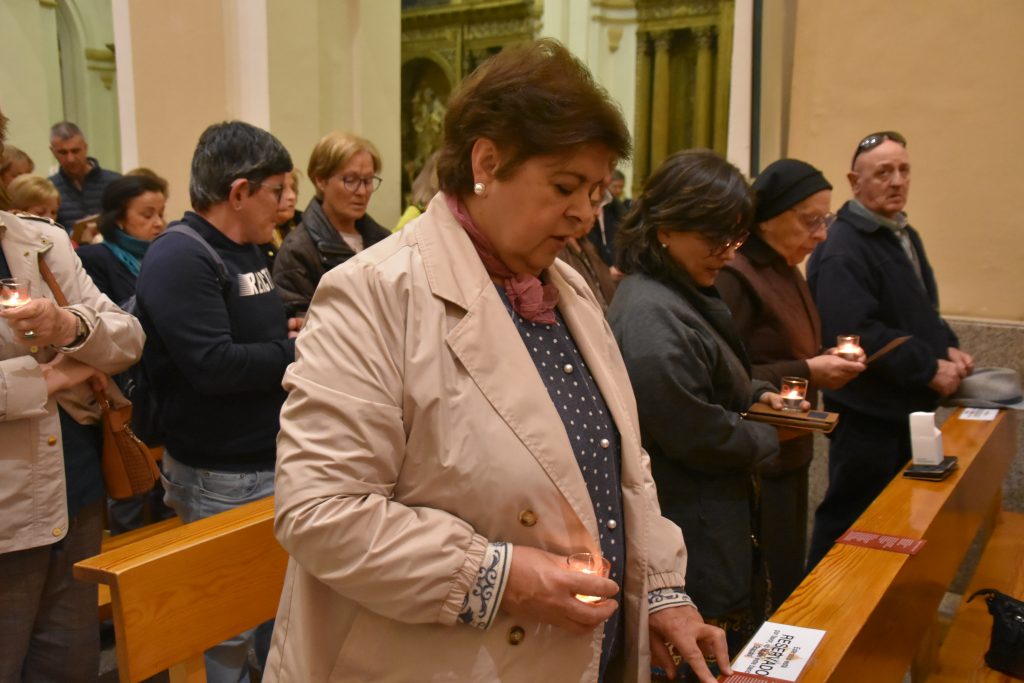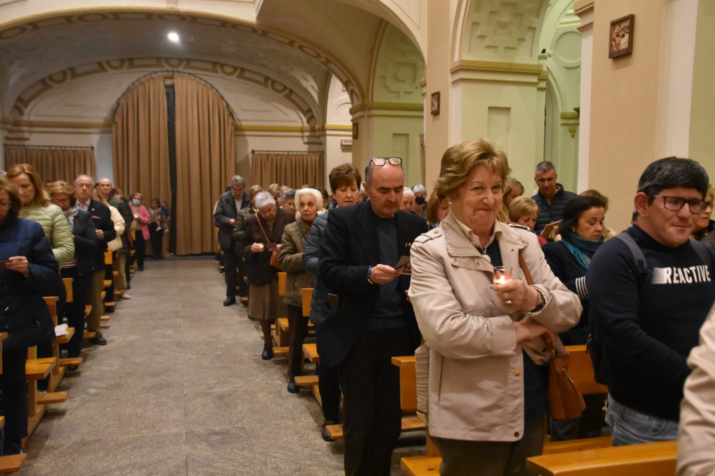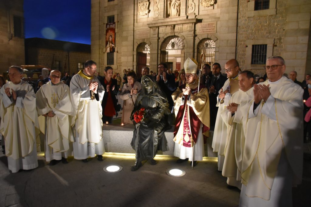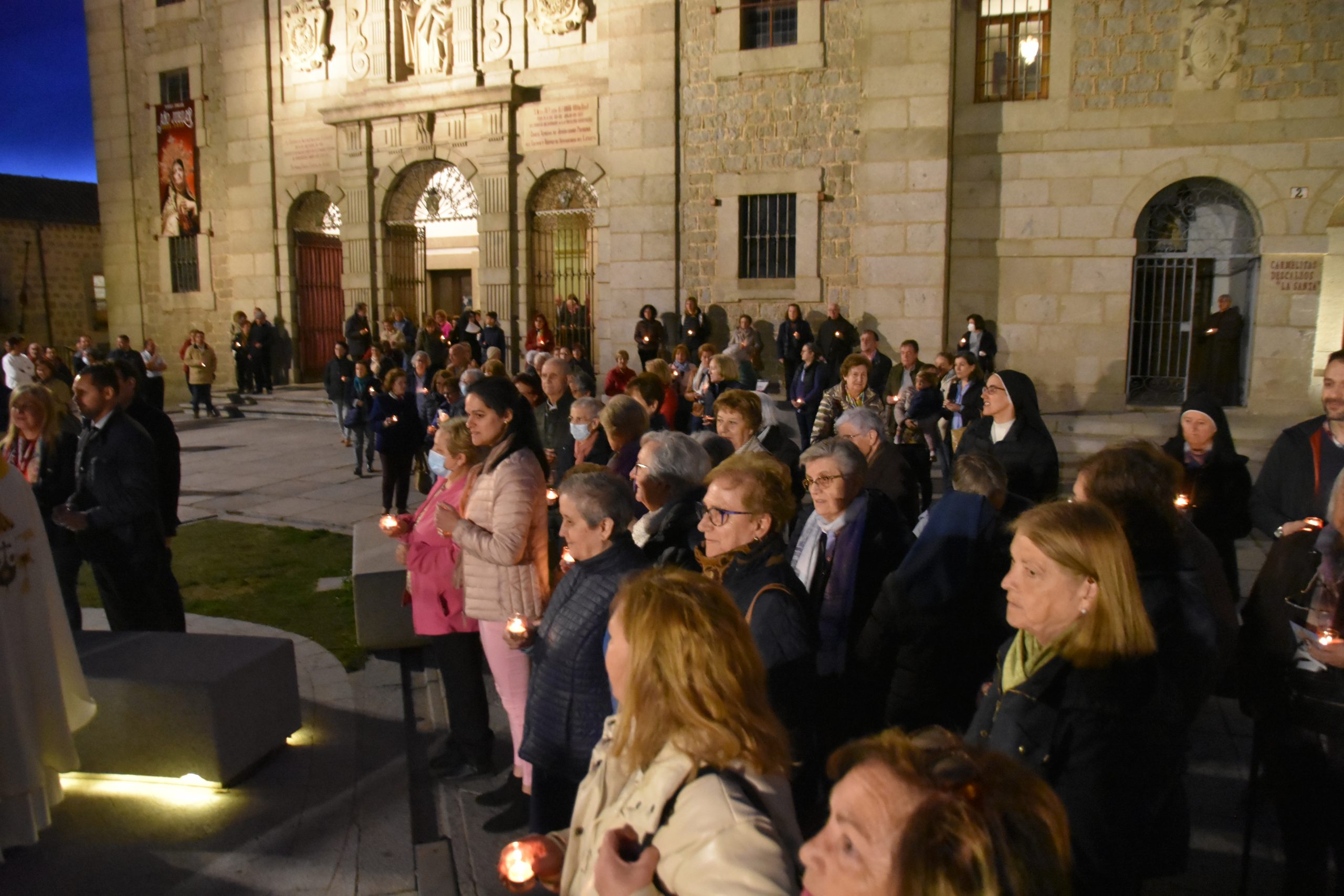 Justo después de la Comunión, se procedió al encendido de las más de 300 velas que se habían repartido a la entrada a todos los asistentes, y que llevaban serigrafiado el logo de la ciudad de Ávila y el del Año Jubilar. Tomando el fuego del cirio que presidía el altar, una a una se encendieron estas pequeñas luces en las manos de los fieles, quienes, al concluir la Eucaristía, cantaron juntos el «Cumpleaños Feliz» a su vecina más ilustre. Y, con las velas encendidas y el templo casi en penumbra, se produjo esa bella estampa de cariño y cercanía de Ávila con su Santa, saliendo juntos los fieles hacia la plaza y rodeando con las velas la imagen que preside la plaza de la Basílica. Una imagen para el recuerdo de un cumpleaños más que feliz, que será, sin duda, recordado como uno de los más emotivos de los últimos años.