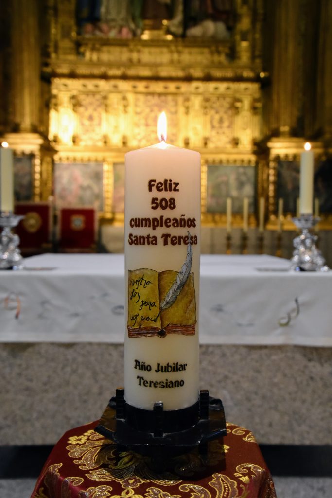 Con una Basílica llena hasta los topes, pues la ciudad y los abulenses querían mostrar así su cariño y fervor por la Santa andariega. Y con algo que atraía las miradas de cuantos iban llegando a tomar asiento. Allí, en medio del altar, un pequeño cirio encendido felicitaba a Santa Teresa, recordando además que este cumpleaños coincide con la celebración del Año Jubilar Teresiano, pedido por la diócesis de Ávila y concedido por la Santa Sede. El cirio había sido encargado para la ocasión a las hermanas carmelitas descalzas del monasterio de La Encarnación, lugar donde la propia Teresa pasaría la mayor parte de su vida y donde se forjó su profunda espiritualidad.