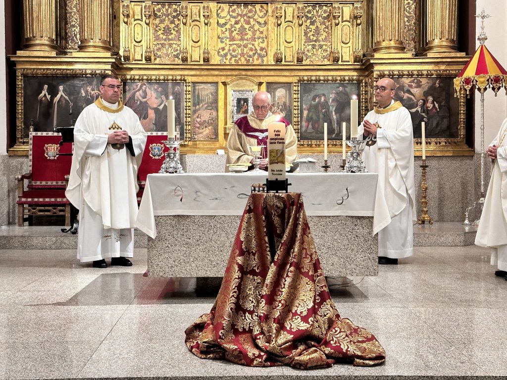 Tras la homilía, prosiguió la celebración eucaristía, que estuvo acompañada por los catos del Coro Gregoriano de La Santa, interpretando varias obras musicalizadas de la pluma de Santa Teresa. Junto al Administrador Diocesano, en el altar concelebraban entre otros el Prior de la Basílica (Padre David Jiménez) y el Vicario de Pastoral y Delegado episcopal para los Jubileos Teresianos (D. Jorge Zazo).