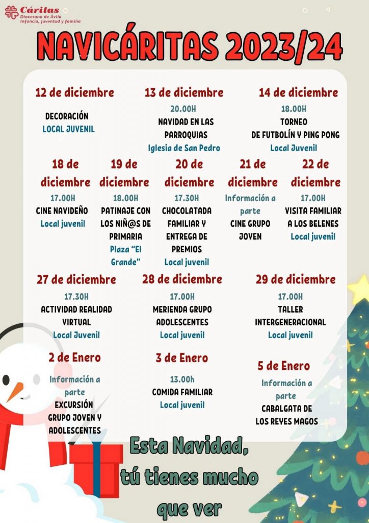 Como cada año en estas fechas, el programa de Infancia, Juventud y Familia de Cáritas diocesana de Ávila invita en Navidad a ser oportunidad y esperanza para las personas que sufren la guerra y la exclusión social. Y lo hacen a través de NaviCáritas, un programa de actividades lúdicas, de encuentro y esperanza destinadas tanto a niños, adolescentes, jóvenes, familias y voluntarios de la entidad. Torneos, excursiones familiares, chocolatadas, visita a parroquias, talleres intergeneracionales, una tarde en la pista de hielo, o la participación en la Cabalgata de Reyes son sólo algunos ejemplos de lo que podrán disfrutar las familias y los jóvenes a quienes atiende Cáritas en Ávila.
