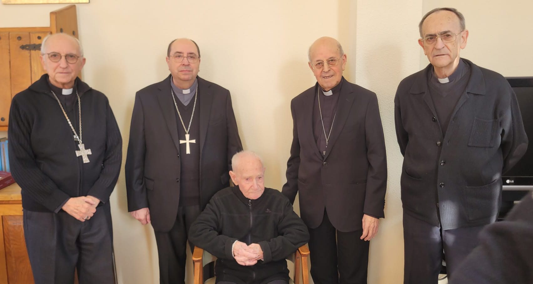 Fuerza que conserva ahora, a sus 100 años, pues aunque se note el paso del tiempo, sigue mostrándose tan lozano como siempre. Por eso, Don Virgilio ha podido celebrar hoy su cumpleaños de una forma sencilla pero entrañable. «A él no le gustan mucho estas cosas, no es de festejos, porque siempre ha sido un hombre muy humilde y callado», nos contaba una de sus familiares. Pero la Casa Sacerdotal había preparado una bonita mañana para compartir con sus hermanos de presbiterio. Comenzando con una Misa presidida por nuestro obispo D. Jesús. En ella, ha querido dar gracias a Dios por la vida y el ministerio de Don Virgilio, ejemplo de entrega sacerdotal. Mons. Rico, en su homilía, recordaba las claves de vida de un sacerdote como el centenario homenajeado: «humildad (renunciando a toda comodidad y sembrando a largo plazo), fidelidad (que no vale con ser material o aparente, pero por dentro mostrarnos huecos), y gratitud (superando el falso autoconcepto de que no le debemos nada a nadie)».