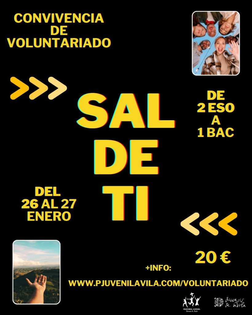 Continuando en la misma linea de formación en el compromiso con la caridad dentro de la Iglesia, que es el objetivo de este curso del Plan diocesano de Pastoral, el Secretariado diocesano de Pastoral Juvenil ha programado para este fin de semana unas jornadas de convivencia para adolescentes dese 2º de ESO hasta Bachillerato, con el lema «Sal de ti».