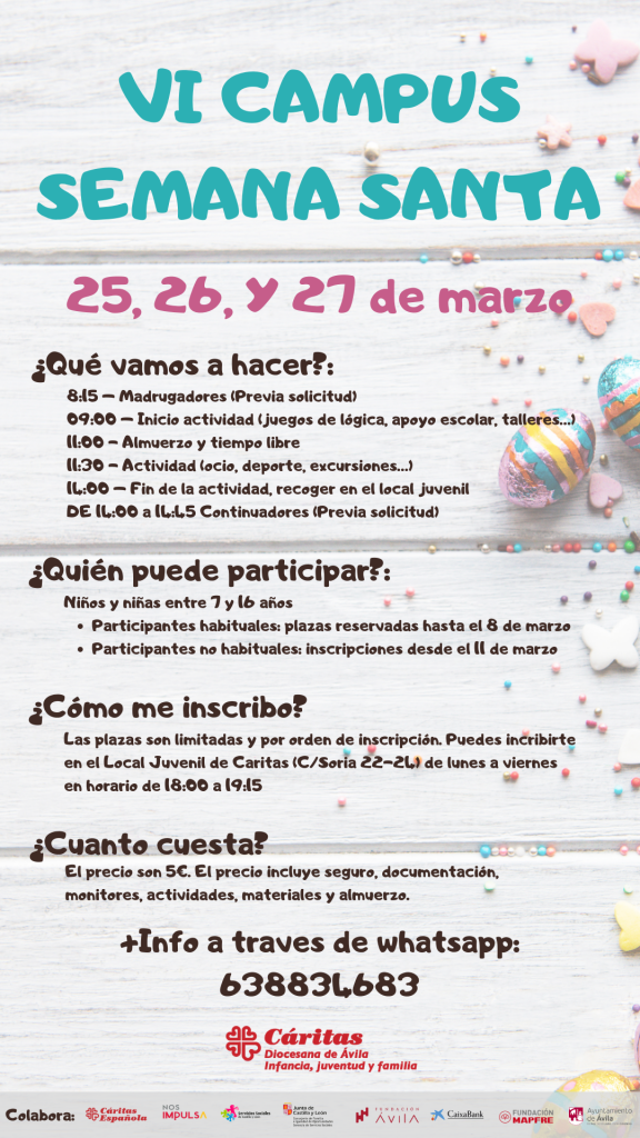 Dentro de pocos días llegarán las vacaciones escolares por Semana Santa. Y, una vez más, Cáritas diocesana de Ávila, a través del programa de Infancia, Juventud y Familia, ofrece un Campus Urbano con un doble objetivo: por un lado, como ayuda a la conciliación familiar en periodos no lectivos; y, por otro y mucho más importante, llevar a cabo distintos objetivos educativos, lúdicos y deportivos.
