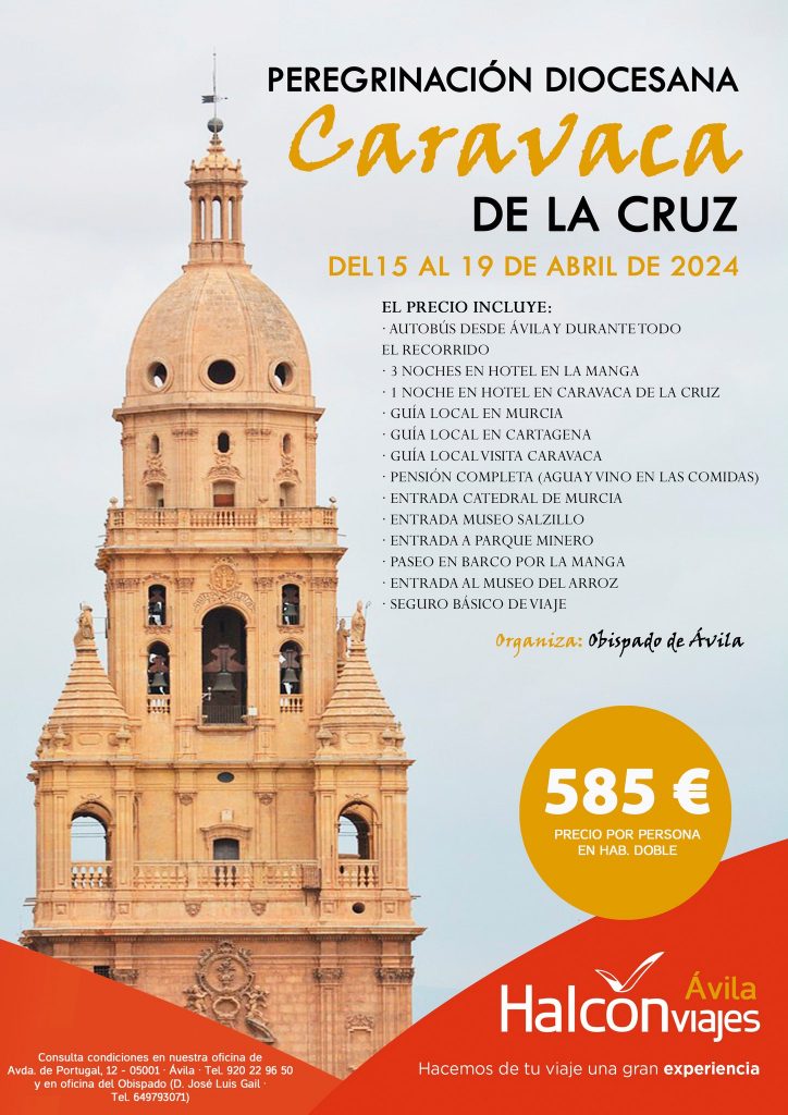 ¿Te vienes a Caravaca? Del 15 al 19 de abril tendrá lugar la peregrinación diocesana a Caravaca de la Cruz, que vive este 2024 su Año Jubilar. Caravaca de la Cruz es una ciudad santa reconocida por el Papa Juan Pablo II. De hecho, es la quinta del mundo en haber obtenido el jubileo perpetuo. Si quieres acompañarnos y celebrar el Año Jubilar de la Vera Cruz, ¡apúntate ya! Además de la peregrinación a la Basílica, podremos visitar las localidades de Caravaca y Murcia, visitar su Catedral, el Museo de Salzillo … y muchas más visitas interesantes que puedes consultar en el cartel.