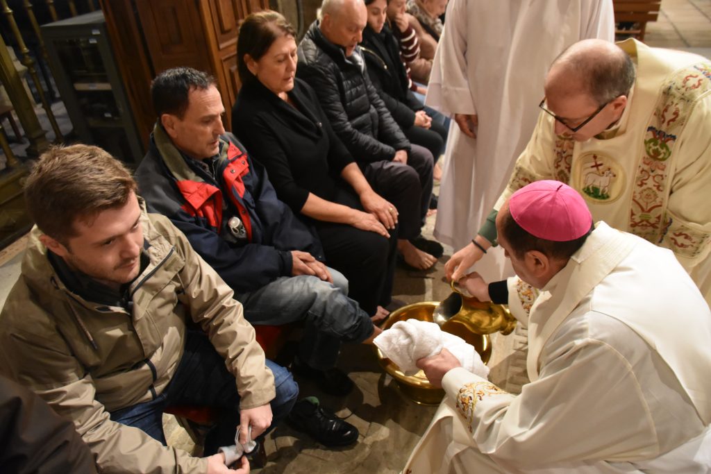 La Eucaristía continuaba con el gesto del lavatorio de los pies a varios fieles, que subían al presbiterio para que Mons. Rico repitiera aquel gesto humilde de Jesús con sus discípulos.