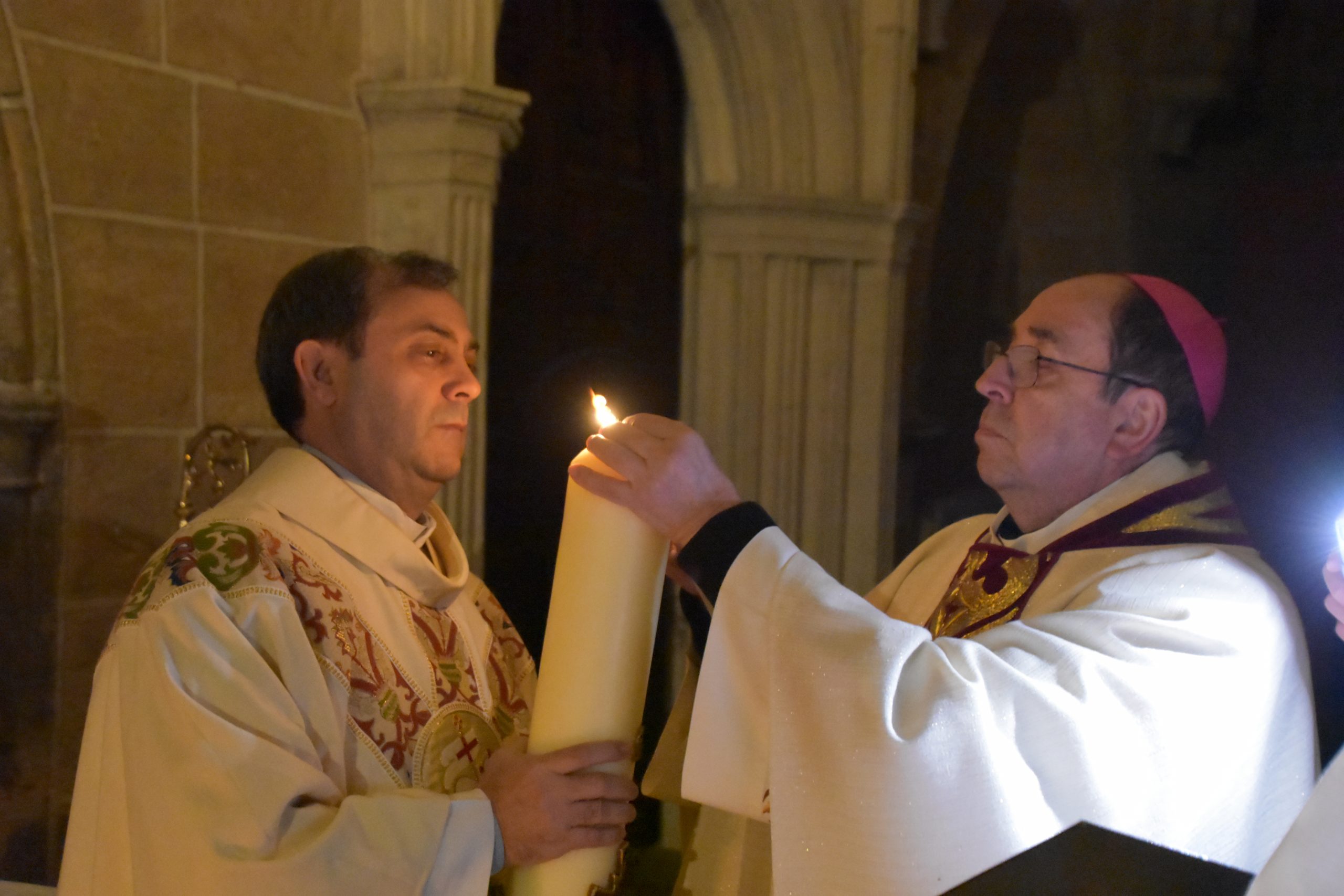 En medio de la más absoluta oscuridad, una luz iluminaba el claustro de la Catedral. La pequeña hoguera, que servía asimismo para calentar a los fieles en una noche aciaga y fría (donde la nieve había hecho acto de presencia), era la imagen de la Luz de Cristo resucitado, que viene a iluminar nuestras tinieblas. A las 22 horas en punto comenzaba allí la Vigilia Pascual, con la bendición del fuego por parte de Mons. Rico García. Él se encargaba asimismo de clavar en el Cirio Pascual los cinco granos de incienso, que representan las cinco llagas de Jesús: los tres clavos que le atravesaron las manos y los pies, la lanza clavada al costado derecho del torso y las espinas sobre su cabeza.