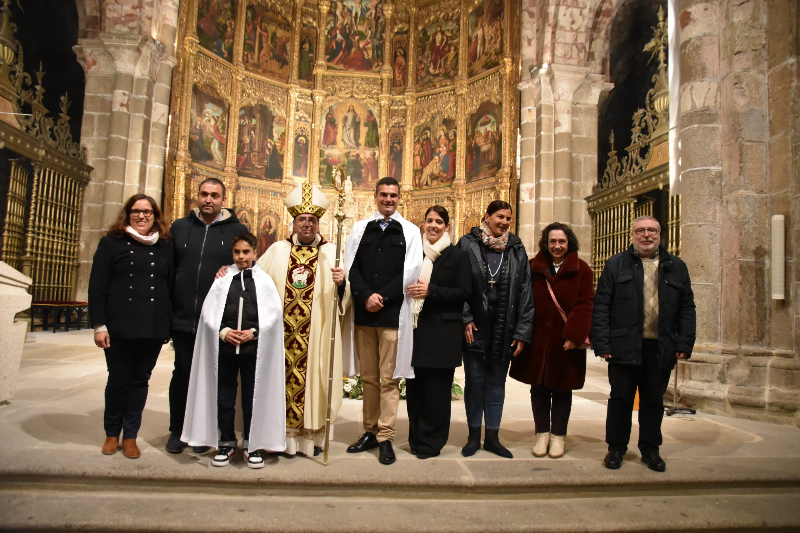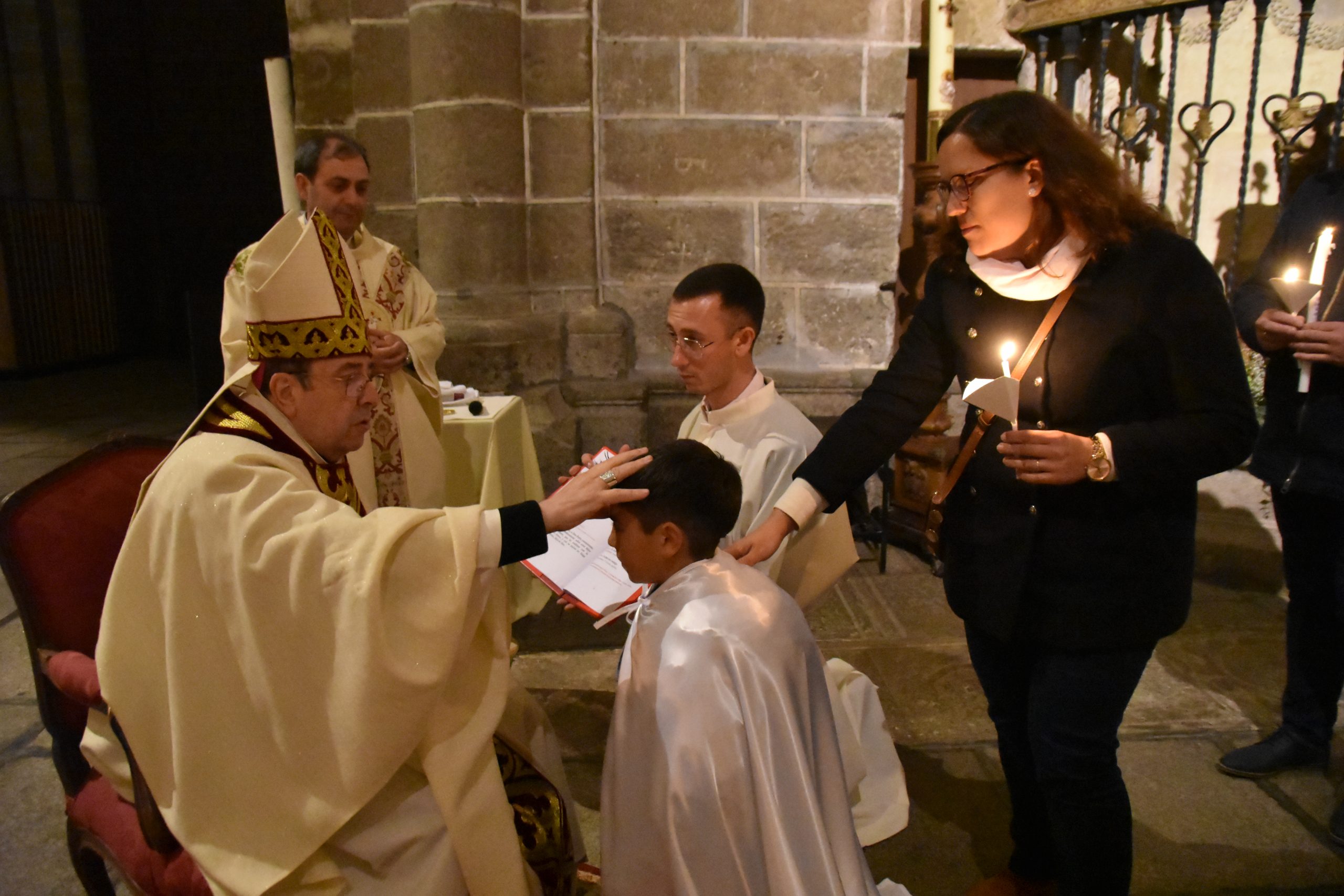 Tras la Liturgia de la Palabra, el Obispo, los sacerdotes concelebrantes y todos los fieles se dirigían, cantando las Letanías de los Santos, hacia la Pila Bautismal, ubicada a la entrada de la Catedral. Esta magnifica pieza de alabastro, obras de Vasco de la Zarza, acogía la bienvenida de la Iglesia, por medio del Bautismo, de Andrés y Diego, dos catecúmenos (un niño y un adulto) que recibían el agua santa que más tarde también aspergería Mons. Rico sobre el resto de fieles. Y allí mismo, Andrés y Diego, a los que se les sumó la joven Noemí, recibieron el Sacramento de la Confirmación de manos de Don Jesús, que les impuso el Santo Crisma que él mismo bendijo hace unos días en la Misa Crismal.
