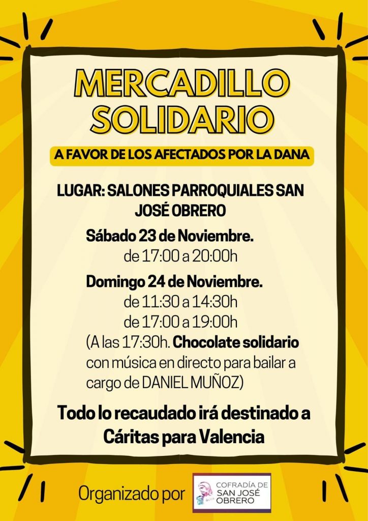 Como se había anunciado, este fin de semana, la Cofradía de San José Obrero pone en marcha un mercadillo solidario a favor de los afectados por la Dana. Durante el sábado y el domingo, en los salones parroquiales de San José Obrero se pondrán a la venta los distintos enseres que han donado los vecinos en las últimas semanas: juguetes, plantas, dulces, bisutería, artesanía … Además, el domingo 24 está previsto también un chocolate solidario, con música en directo y baile, que comenzará a las 17:30 horas. Una apuesta de la cofradía por luchar contra la soledad de los mayores del barrio, proporcionándoles actividades de ocio ligadas a la parroquia y, en este caso, con un fin solidario.