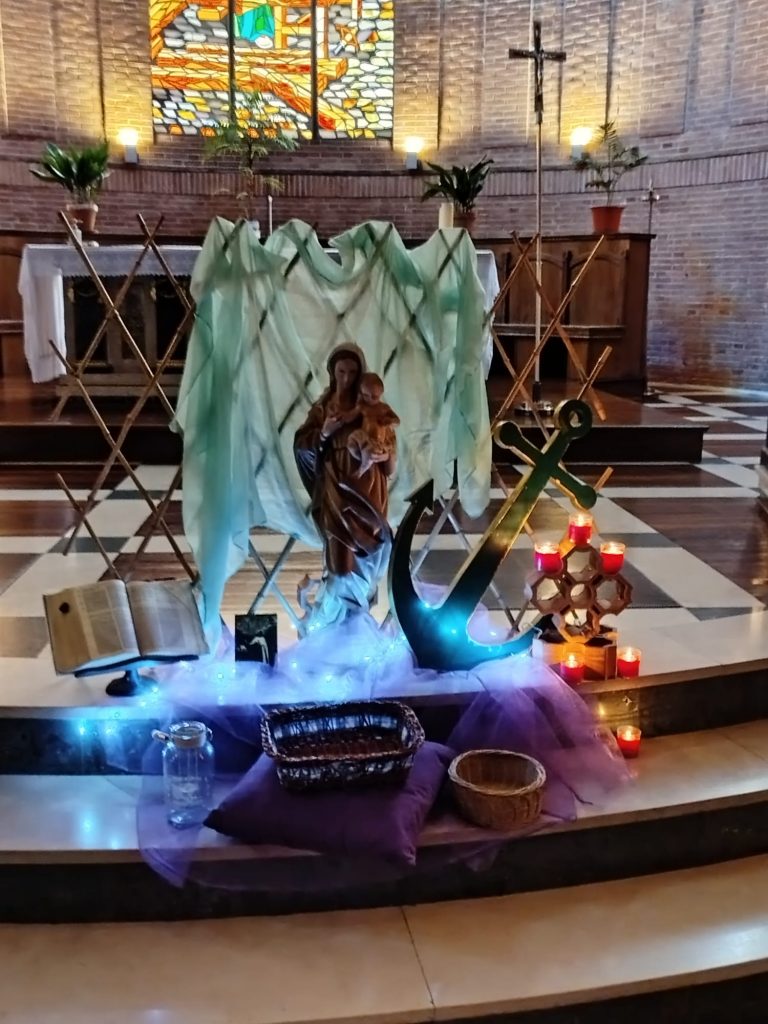 Subimos al templo, ambientado y preparado para hacer oración. Luz suave, imagen de la Virgen, un ancla, velas, canción a guitarra “Sólo tu espíritu”. Recibimos al Santísimo para estar en la presencia viva de Cristo.
