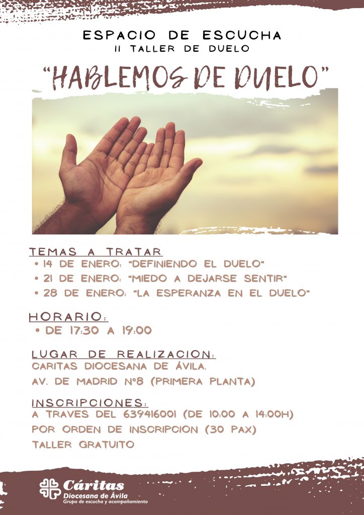 El Espacio de Escucha de Cáritas diocesana de Ávila pone en marcha el II Taller de Duelo, cuya primera sesión tendrá lugar esta tarde de martes. Una iniciativa que consta de tres sesiones formativas para hablar y reflexionar sobre este proceso, para saber cómo afrontarlo de manera natural y qué herramientas disponemos para ello. Porque es necesario seguir hablando de duelo, en una sociedad en la que aún la enfermedad, la dificultad, la muerte siguen siendo un tema complicado de tratar, pero que no podemos evitar pasar por estas experiencias a lo largo de nuestra vida.