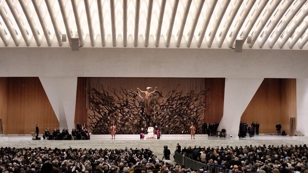 Para concluir el acto, el Papa bendijo a toda la asamblea y saludó uno a uno a los invitados, comenzando por los presentes en el escenario del Aula. En primer lugar, el prefecto del Dicasterio para la Comunicación, Paolo Ruffini, y luego los sentados en la primera fila. Entre ellos, la periodista filipina Maria Ressa, Premio Nobel de la Paz en 2021, y el escritor irlandés Colum McCann, autor de 14 best sellers, entre ellos el aclamado Apeirogon, que cuenta la historia de Bassam Aramin y Rami Elhanan, un israelí y un árabe. Unidos por el dolor por la muerte de sus hijas, de 10 y 13 años, asesinadas en diferentes circunstancias (Francisco las conoció en abril de 2024).