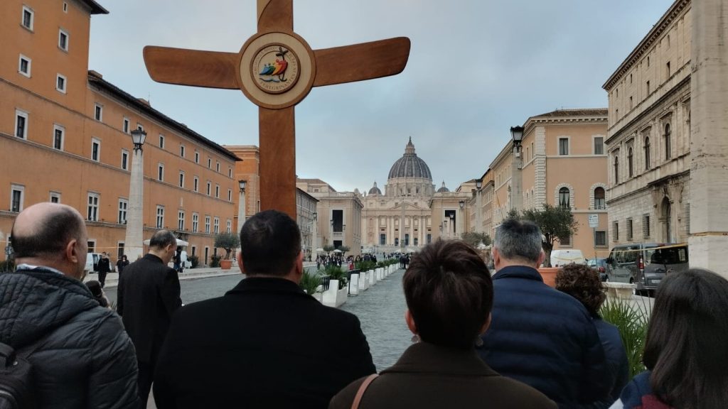 El sábado fue el día escogido para ganar el Jubileo. A las 7 de la mañana el Rector de la Iglesia española de Montserrat, D. José Jaime Brosel y también por el Deán de las Catedrales, D. Francisco Juan Martínez Rojas, muy vinculado con esta institución. Desde allí partió la peregrinación hasta la Basílica de San Pedro, pasando por la Puerta Santa y haciendo la profesión de fe en el altar de la confesión. Un recorrido lleno de espiritualidad, en el que no faltaron momentos de oración y música llena de fe. La Cruz del Peregrino fue portada por los diferentes obispos de la Comisión Episcopal de Medios, así como por diferentes delegados, entre ellos la responsable de comunicación de nuestra diócesis de Ávila.
