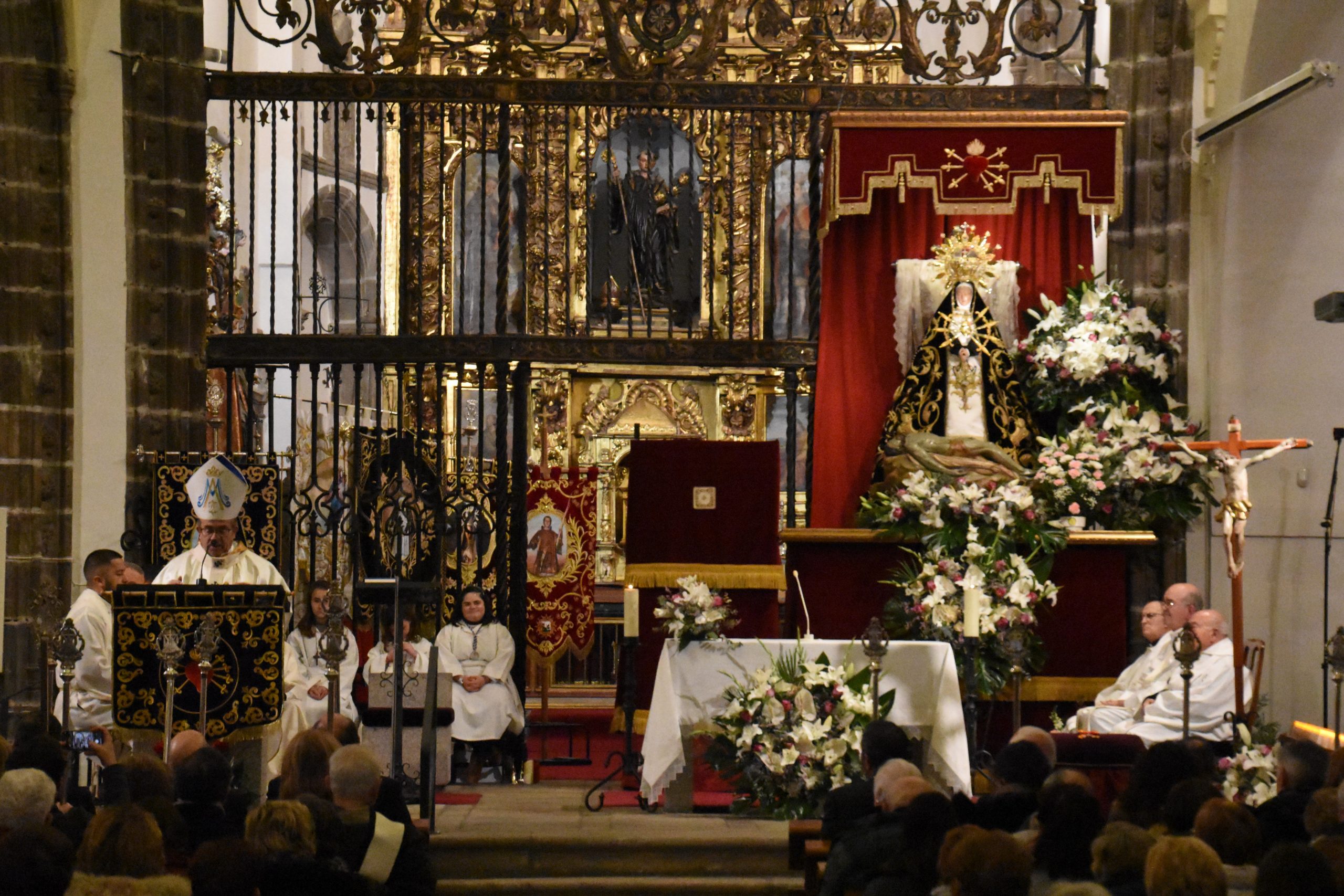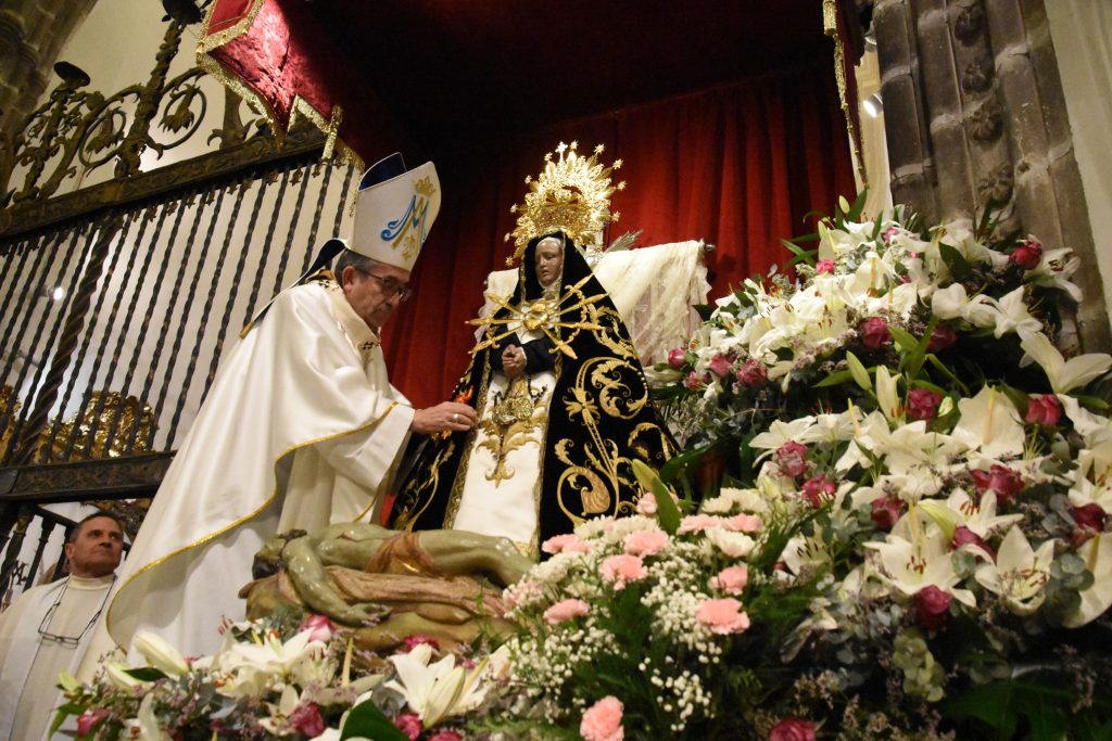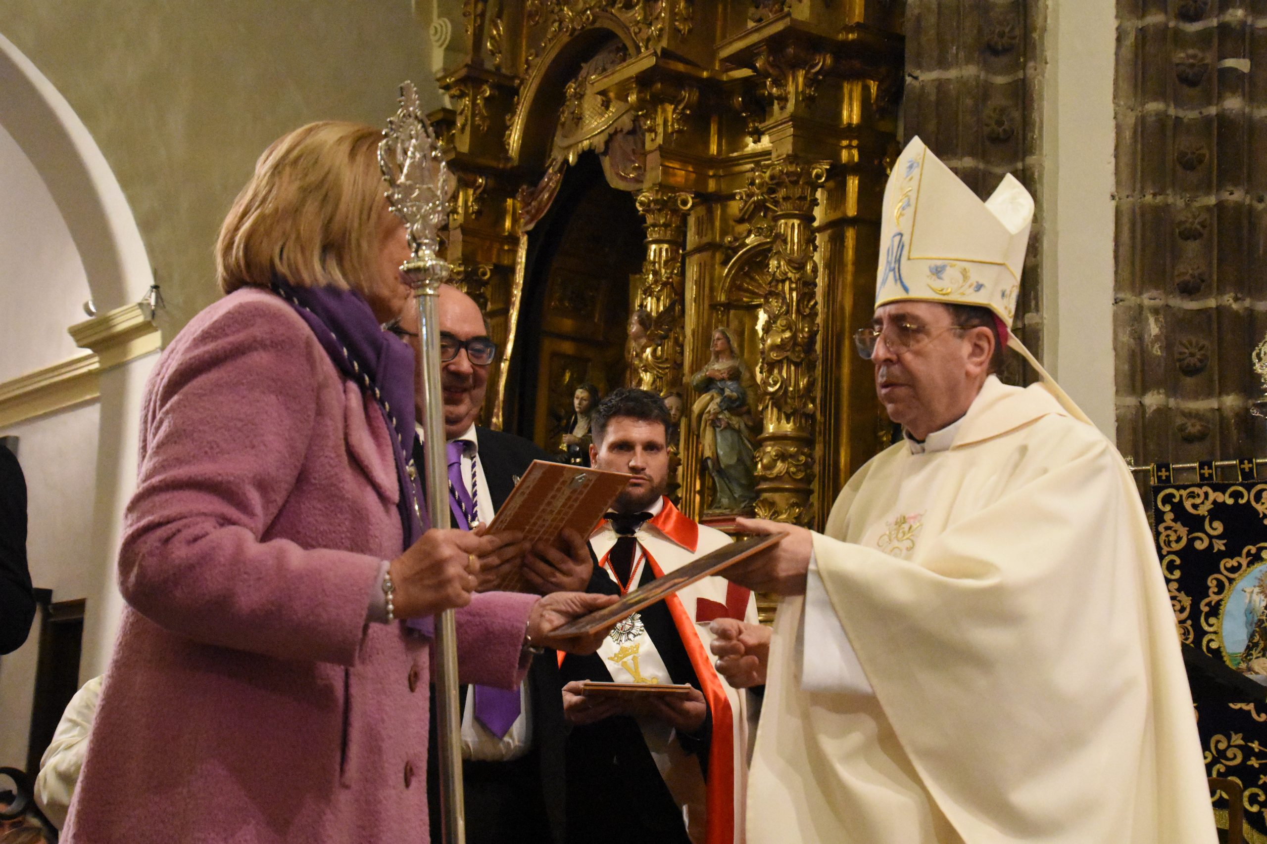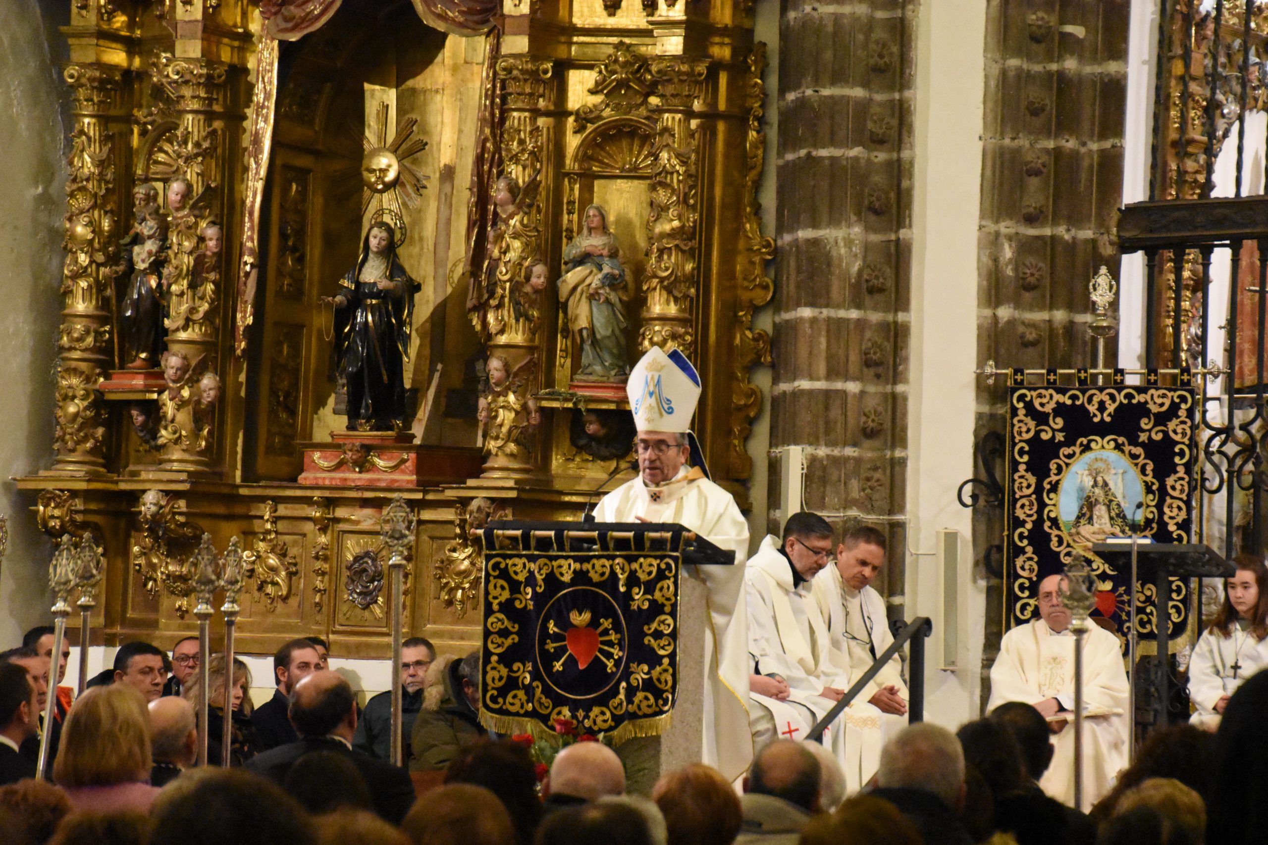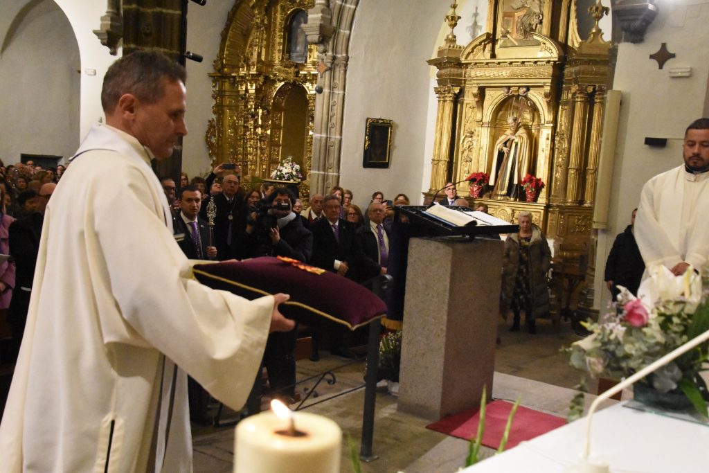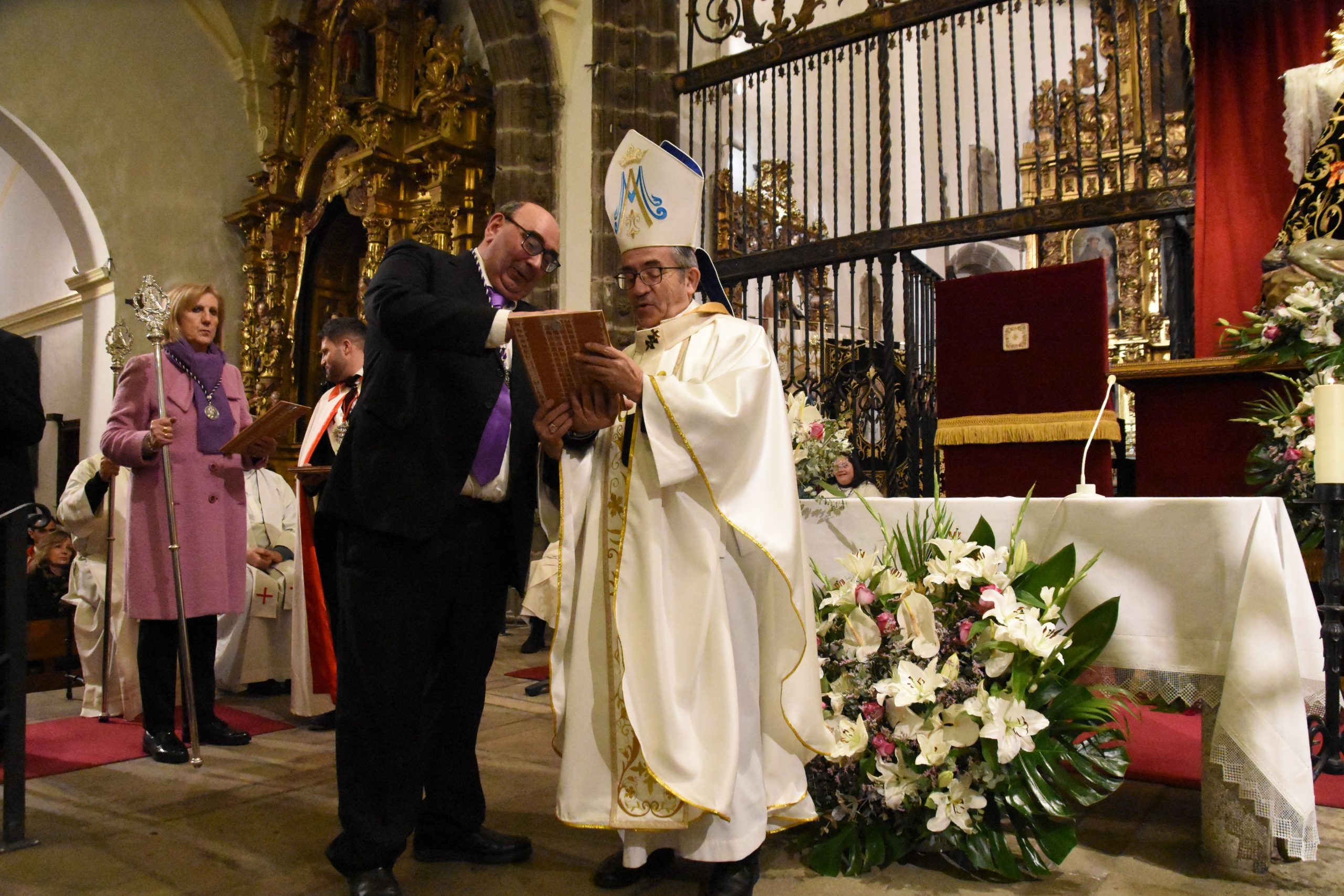 Este miércoles, la localidad abulense de Arévalo vivió una importante jornada histórica y devocional. El arzobispo de Valladolid y presidente de la Conferencia Episcopal Española, Mons. Luis Argüello, impuso la medalla de Isabel la Católica a la Virgen de las Angustias, patrona de este pueblo de la Moraña, y cuya fiesta estamos próximos a celebrar. Al acto también asistieron nuestro Obispo Don Jesús y el párroco de Arévalo, Sebastián Gil, así como varios sacerdotes de parroquias de la zona. Junto a ellos, numerosos fieles que, pese al frío predominante, no quisieron perderse esta noche histórica e hicieron que el templo se mostrase al completo.