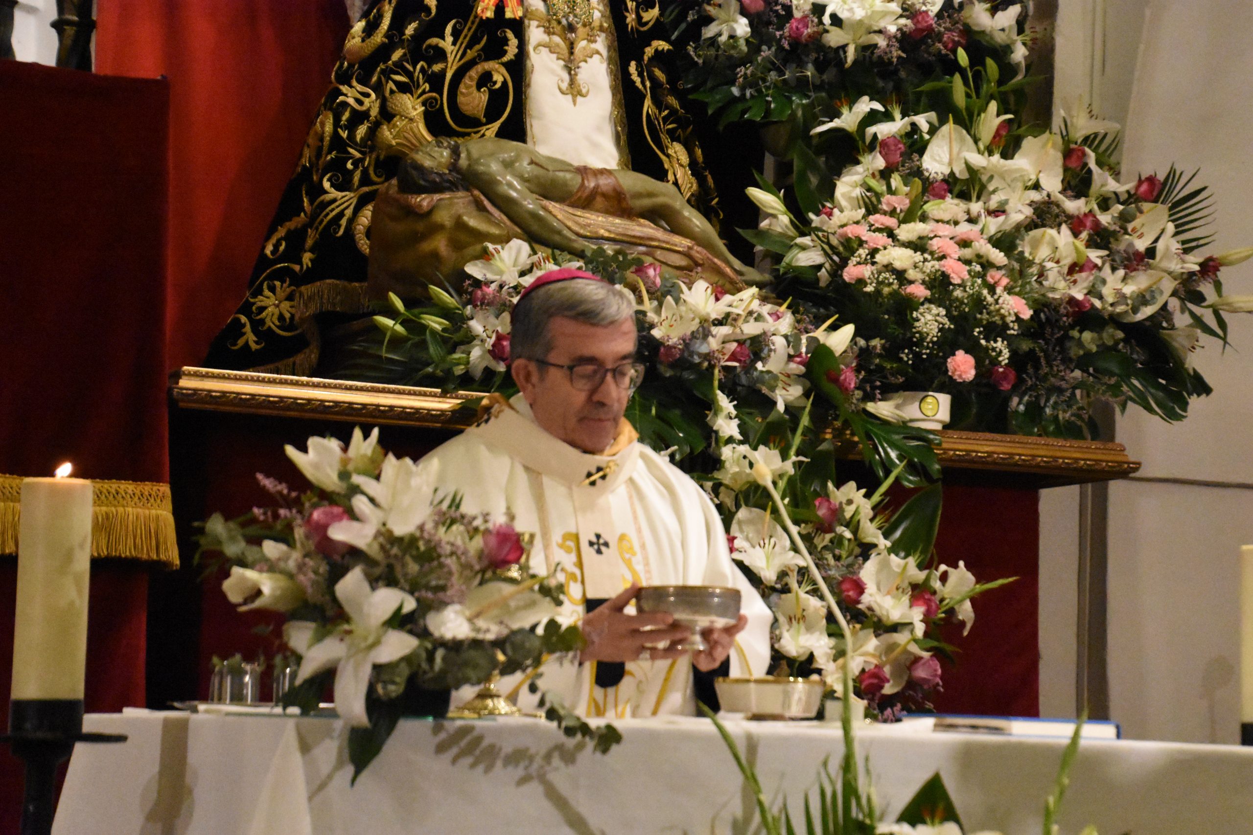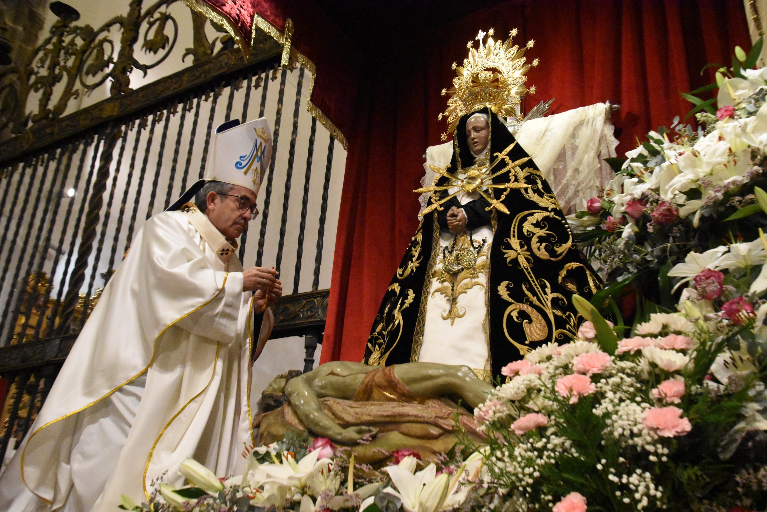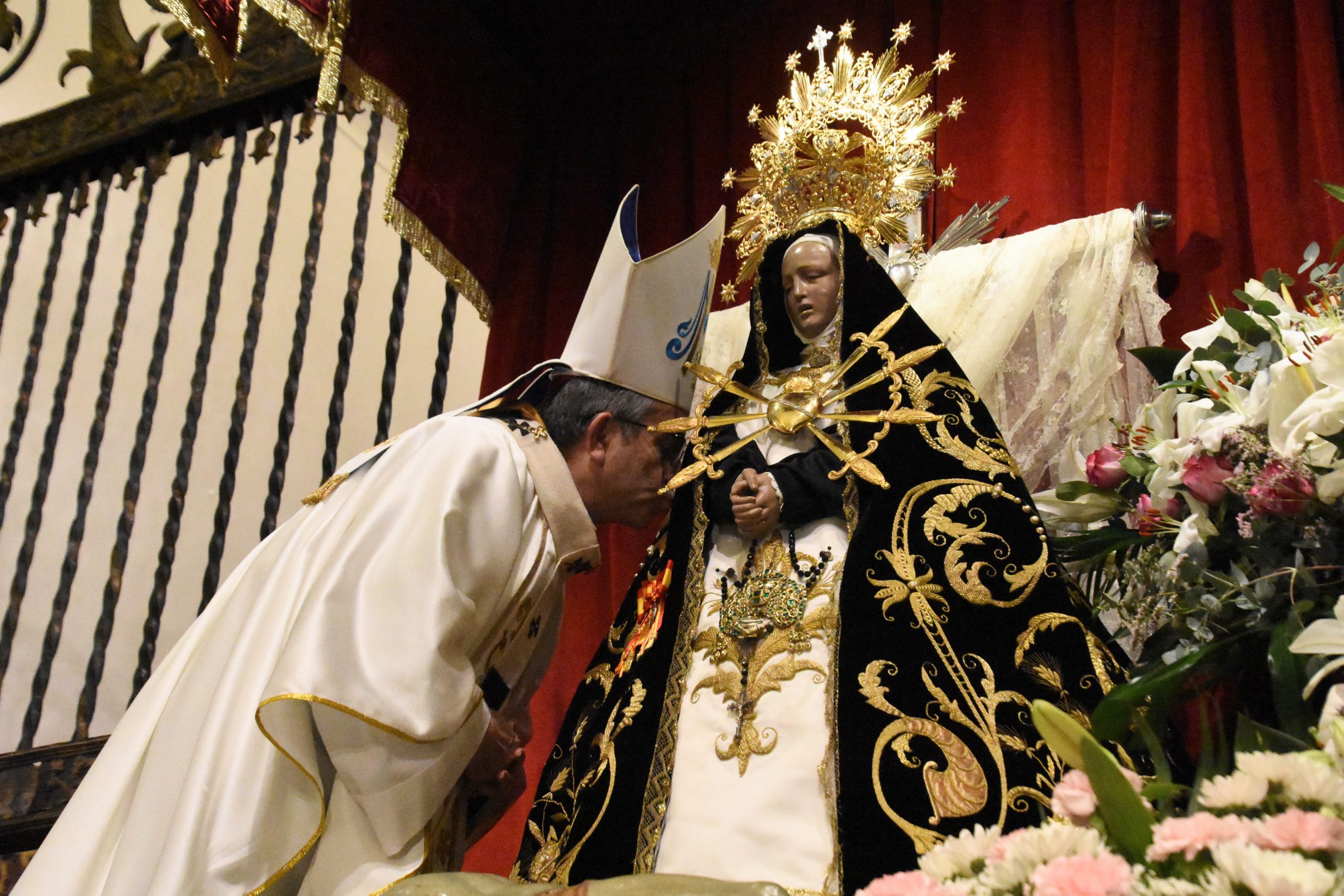 Mons. Luis Argüello coloca la medalla de Isabel la Católica a la Virgen de las Angustias (Foto: Gonzalo G. de Vega / Diócesis de Ávila)