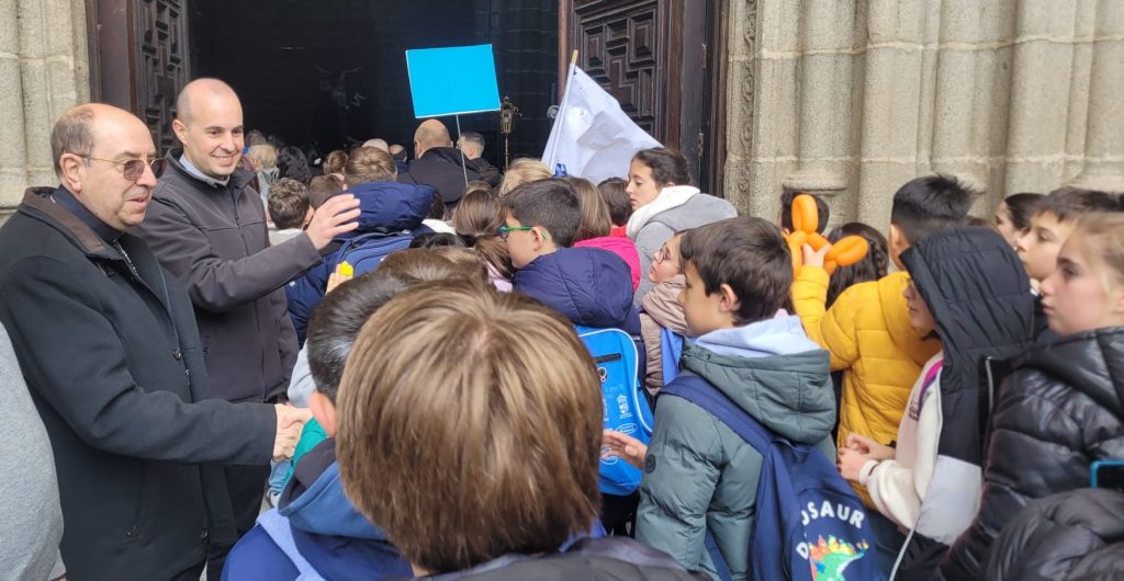 Tras este momento de esparcimiento, llegó el plato fuerte del día: en pleno Año Santo, los niños pudieron peregrinar a pie desde el colegio (ubicado en la zona sur de la capital), cuesta arriba hacia la Catedral, templo jubilar en este 2025. La música y las ganas de los pequeños hicieron que el empinado camino fuera muy llevadero. Al llegar a la plaza del Mercado Grande, sorprendieron a muchos turistas, que se pararon para verles pasar con sus pancartas y sus canciones, preguntándose por qué estaban tan alegres. Una alegría que contagiaba a todos los viandantes.