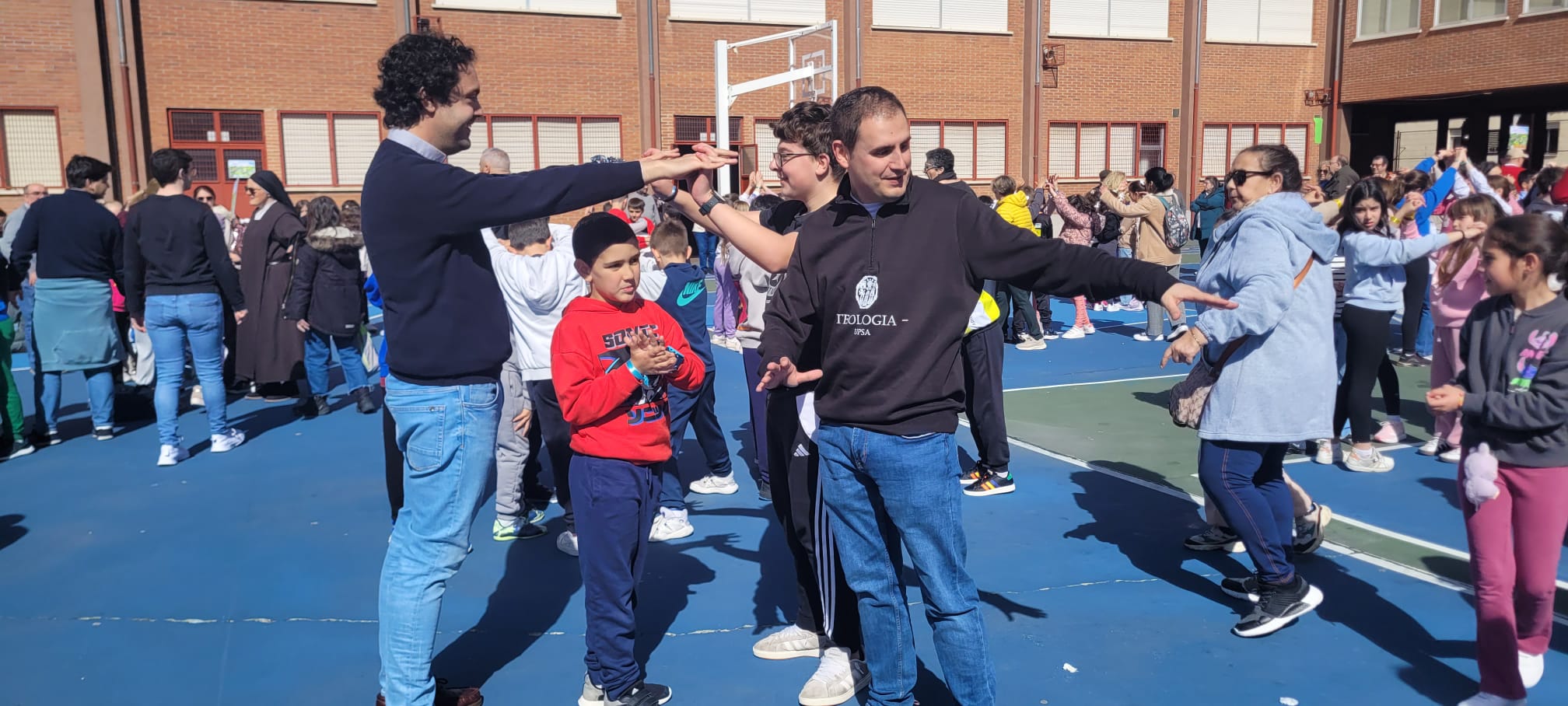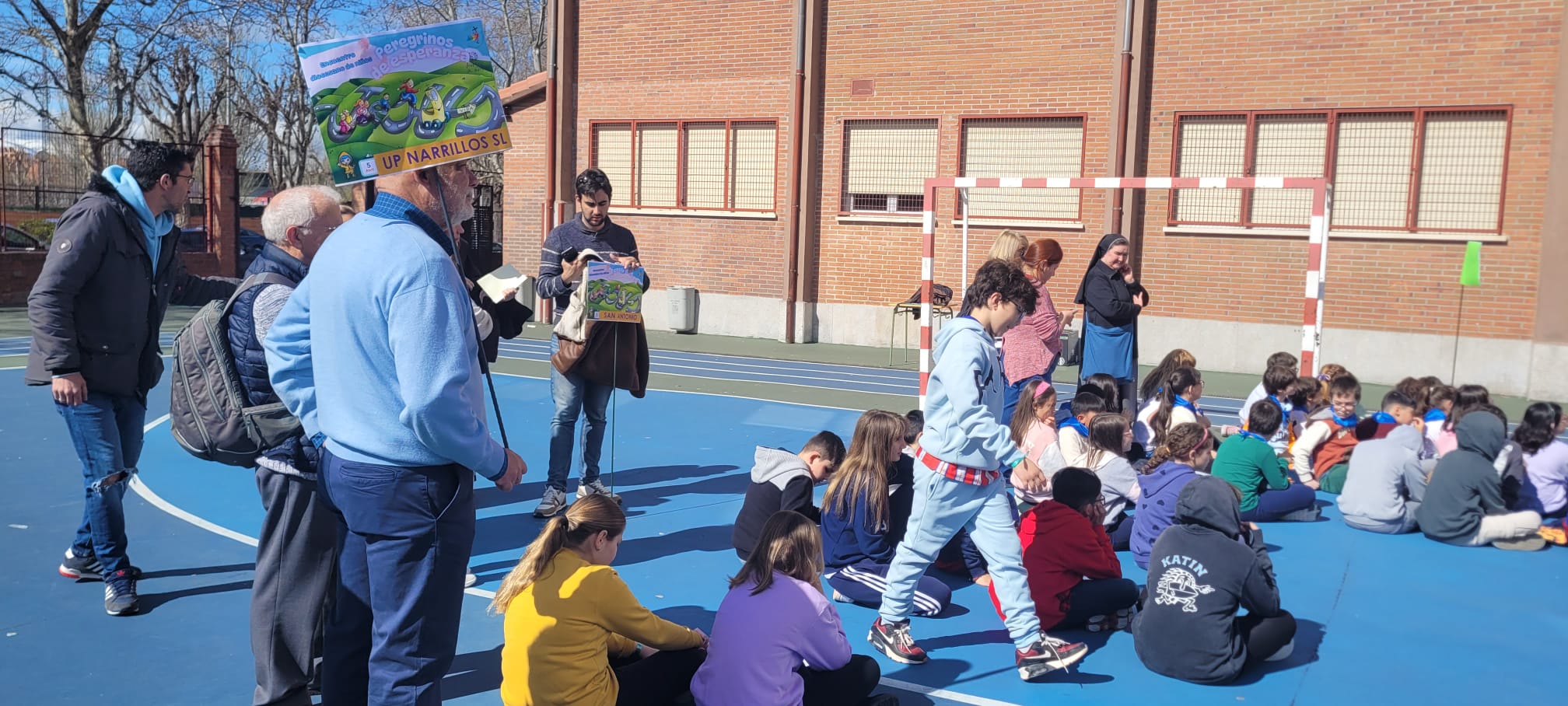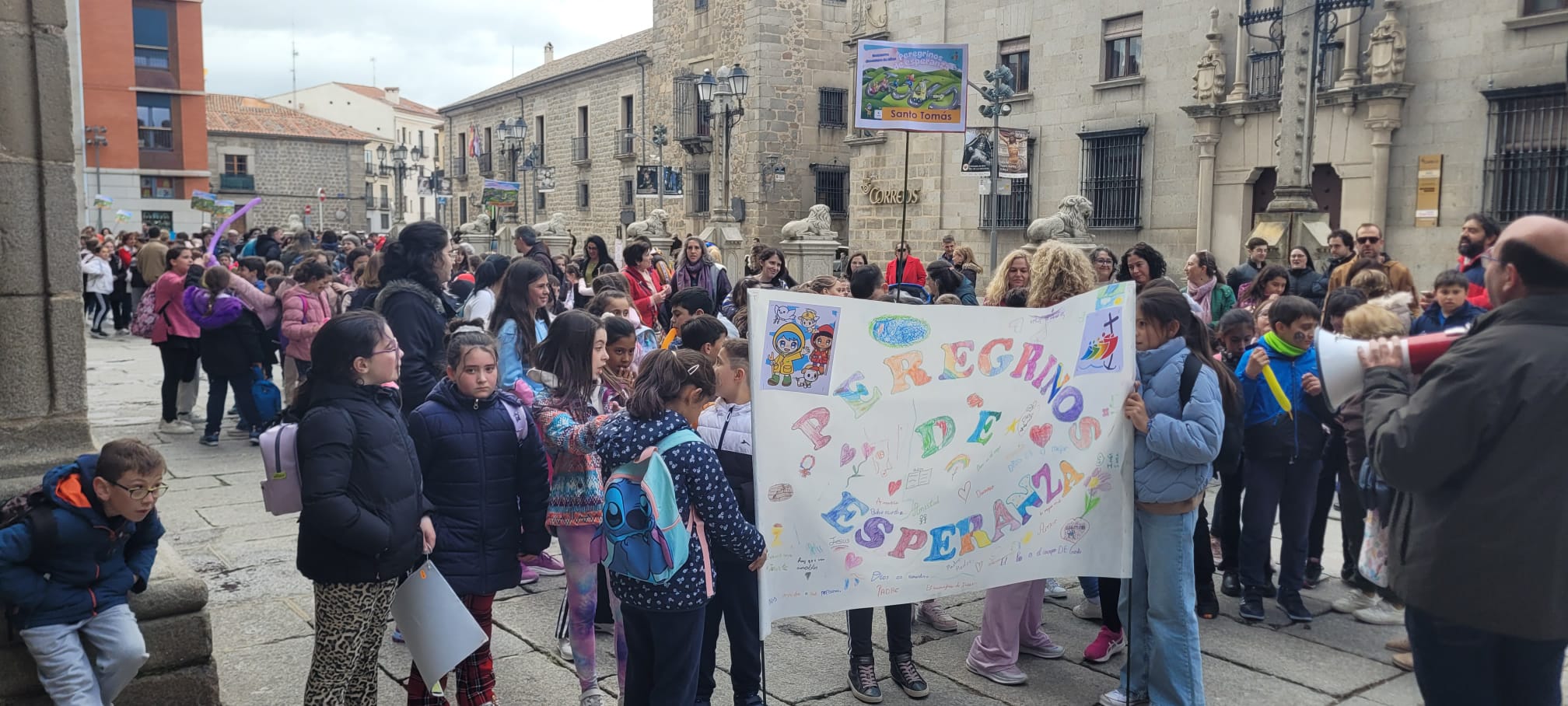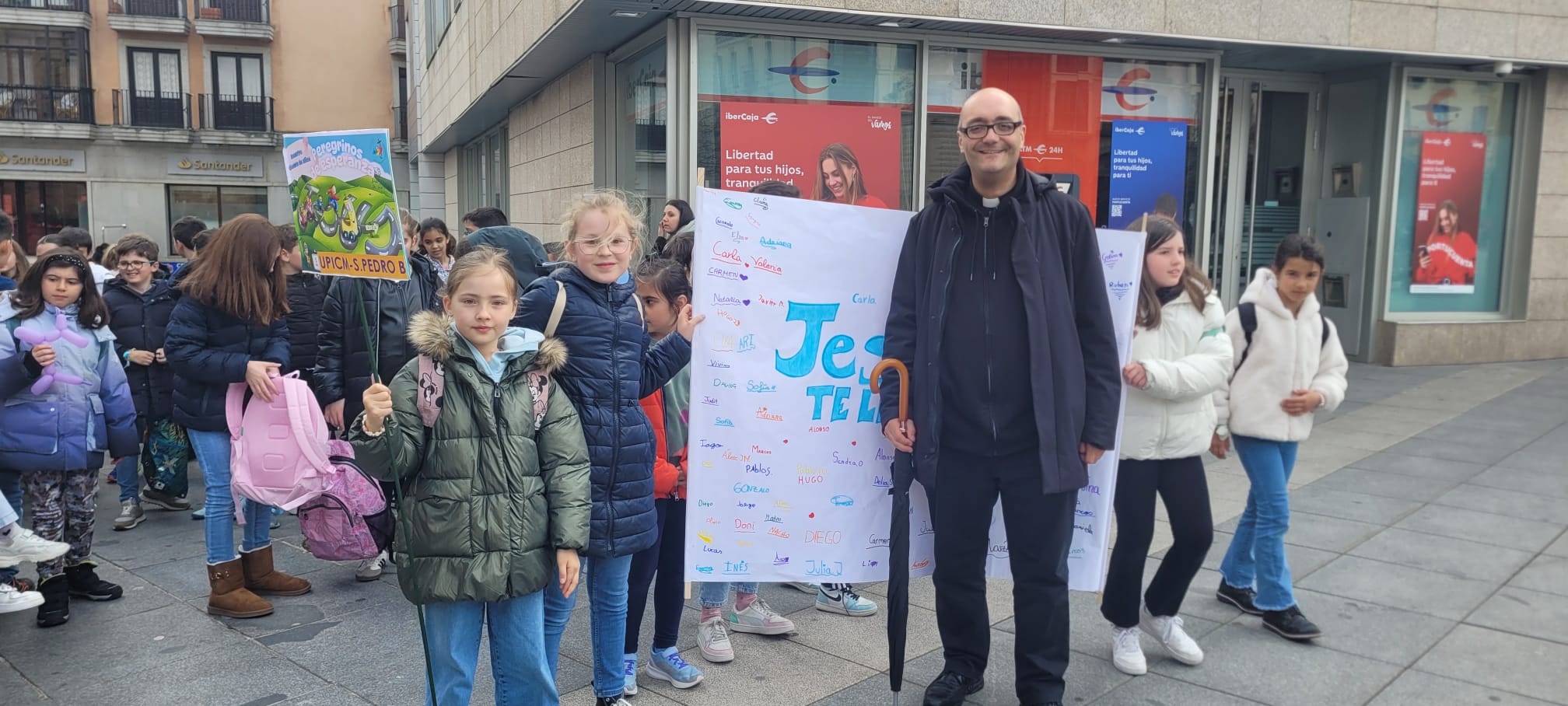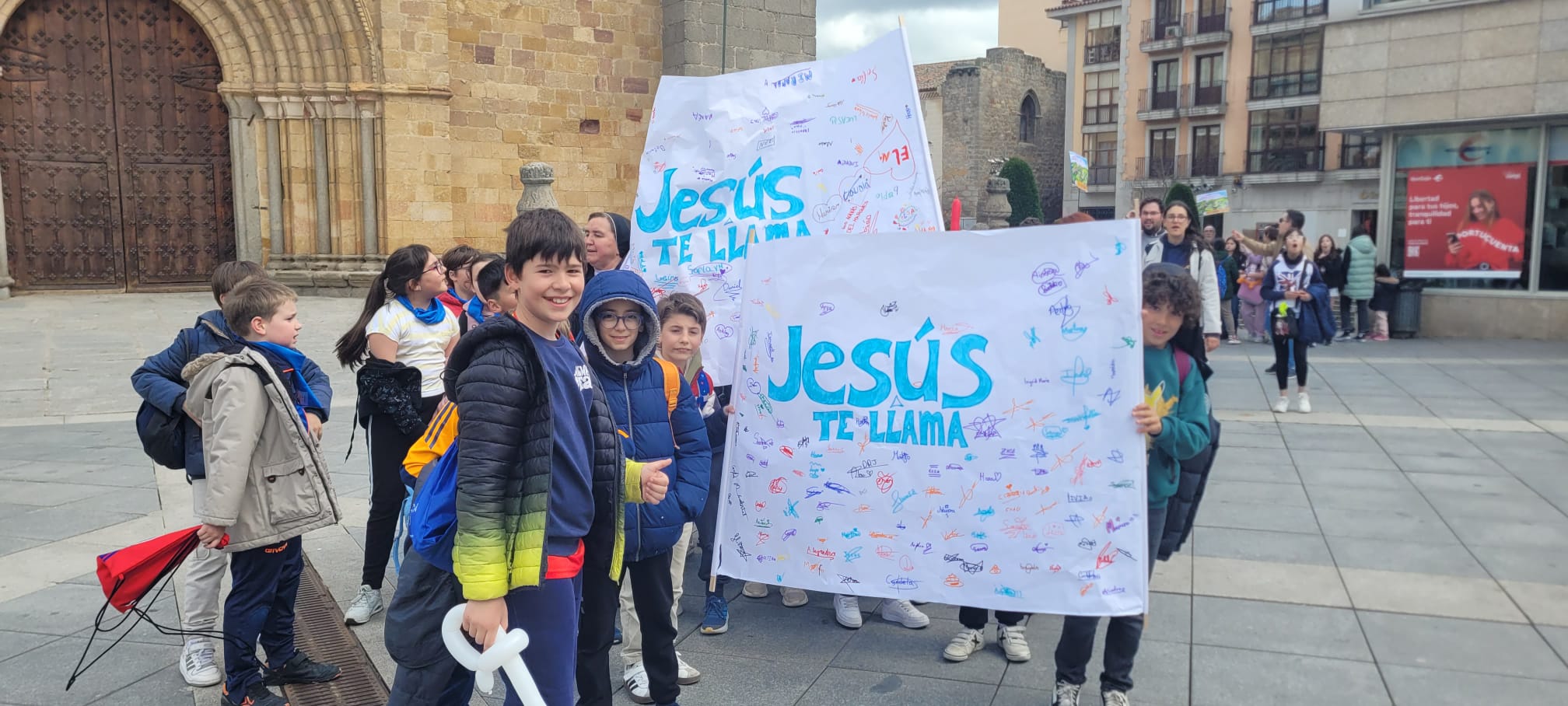 Tras este momento de esparcimiento, llegó el plato fuerte del día: en pleno Año Santo, los niños pudieron peregrinar a pie desde el colegio (ubicado en la zona sur de la capital), cuesta arriba hacia la Catedral, templo jubilar en este 2025. La música y las ganas de los pequeños hicieron que el empinado camino fuera muy llevadero. Al llegar a la plaza del Mercado Grande, sorprendieron a muchos turistas, que se pararon para verles pasar con sus pancartas y sus canciones, preguntándose por qué estaban tan alegres. Una alegría que contagiaba a todos los viandantes.