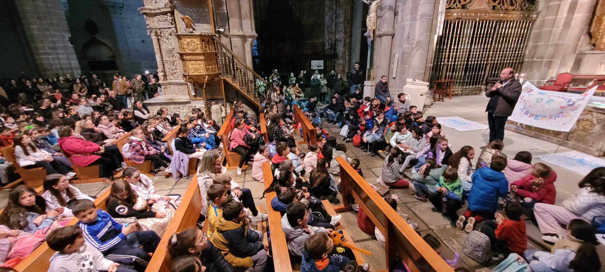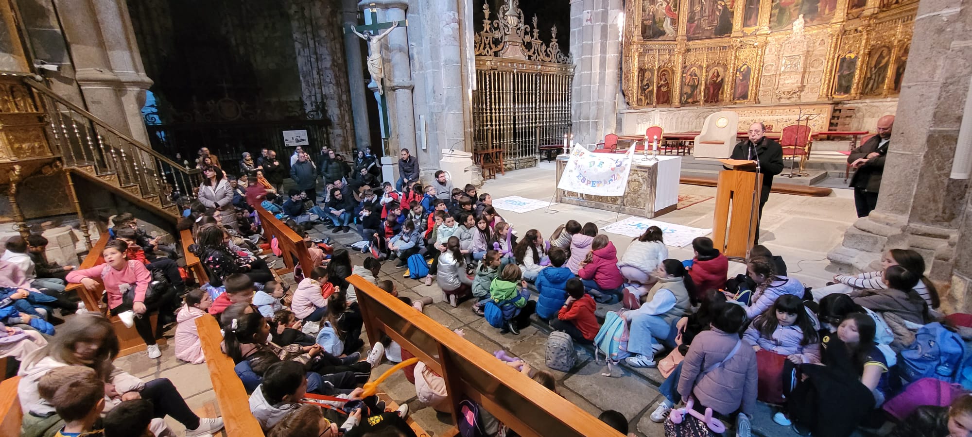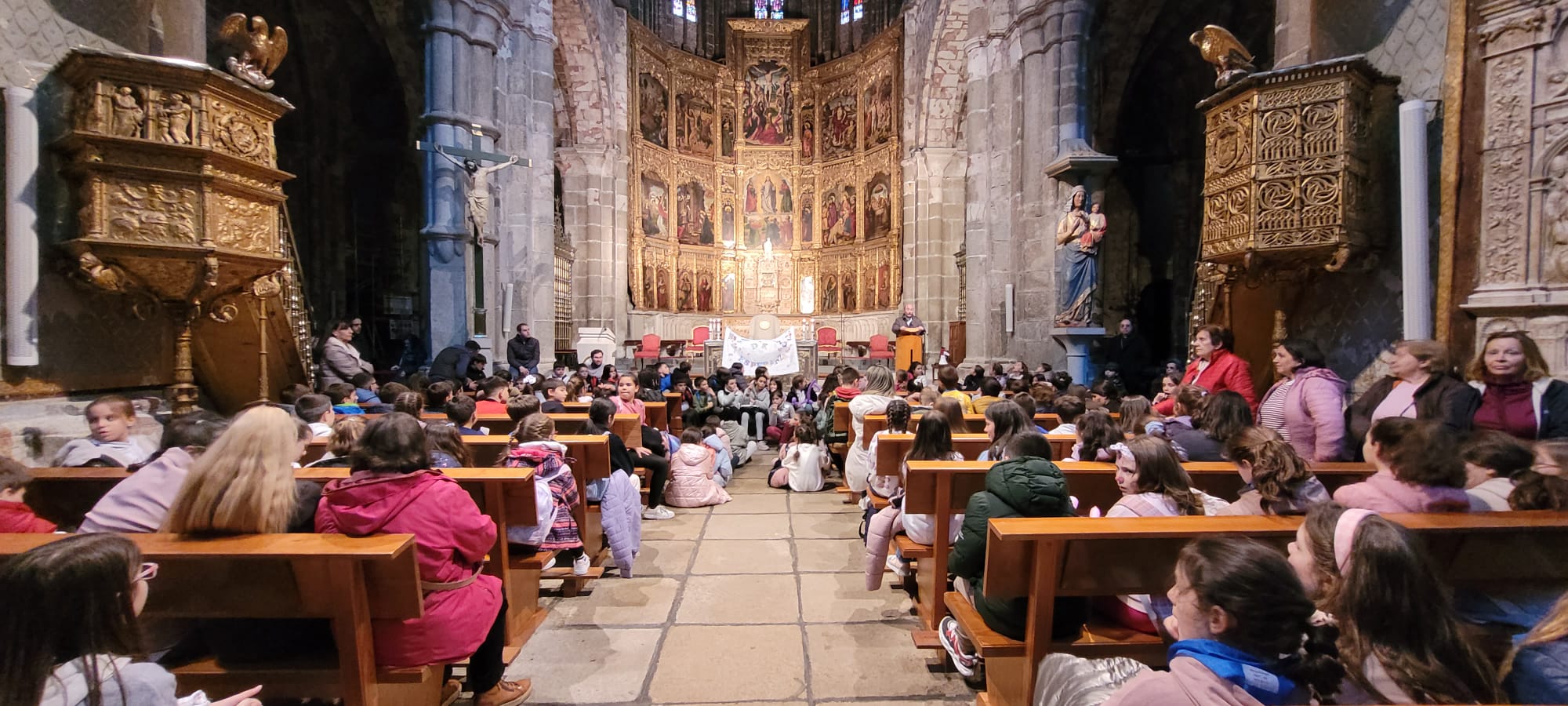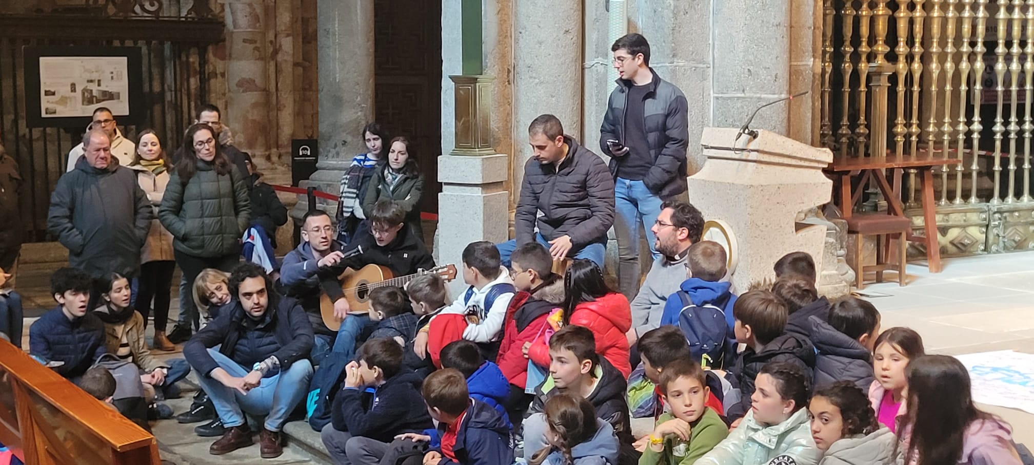 Al llegar a la Catedral, les esperaba nuestro obispo Don Jesús, quien les invitó a pasar al interior del templo para así poder ganar el Jubileo. Casi no cabían en la nave central, por lo que muchos de ellos no dudaron en echarse al suelo para poder seguir las explicaciones de D. Raúl, el responsable de la Pastoral Vocacional en la diócesis, quien les contó, como si de una catequesis plástica se tratara, todos los entresijos del retablo del altar mayor.