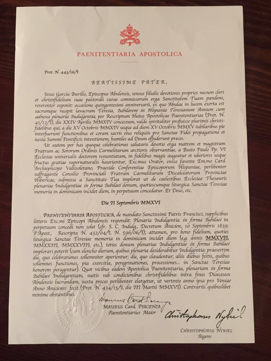 “Con motivo del 400 aniversario de la beatificación de Santa Teresa, que celebramos este 24 de abril de 2014, el Obispado de Ávila quiere comunicar el Decreto de la Penitenciaría Apostólica, por el cual el Papa Francisco concede la gracia de Año Jubilar Teresiano en España, desde el día 15 de octubre de 2014 hasta el 15 de octubre de 2015, con el fin de celebrar con solemnidad el V Centenario del nacimiento de Santa Teresa de Jesús. Con él, se concederá la Indulgencia Plenaria a los fieles verdaderamente arrepentidos, con las condiciones acostumbradas: Confesión Sacramental, Comunión Eucarística y Oración por las intenciones del Romano Pontífice. En fechas posteriores, se comunicará oportunamente cuáles serán los templos o santuarios jubilares donde los fieles puedan lucrar la Indulgencia Plenaria.
