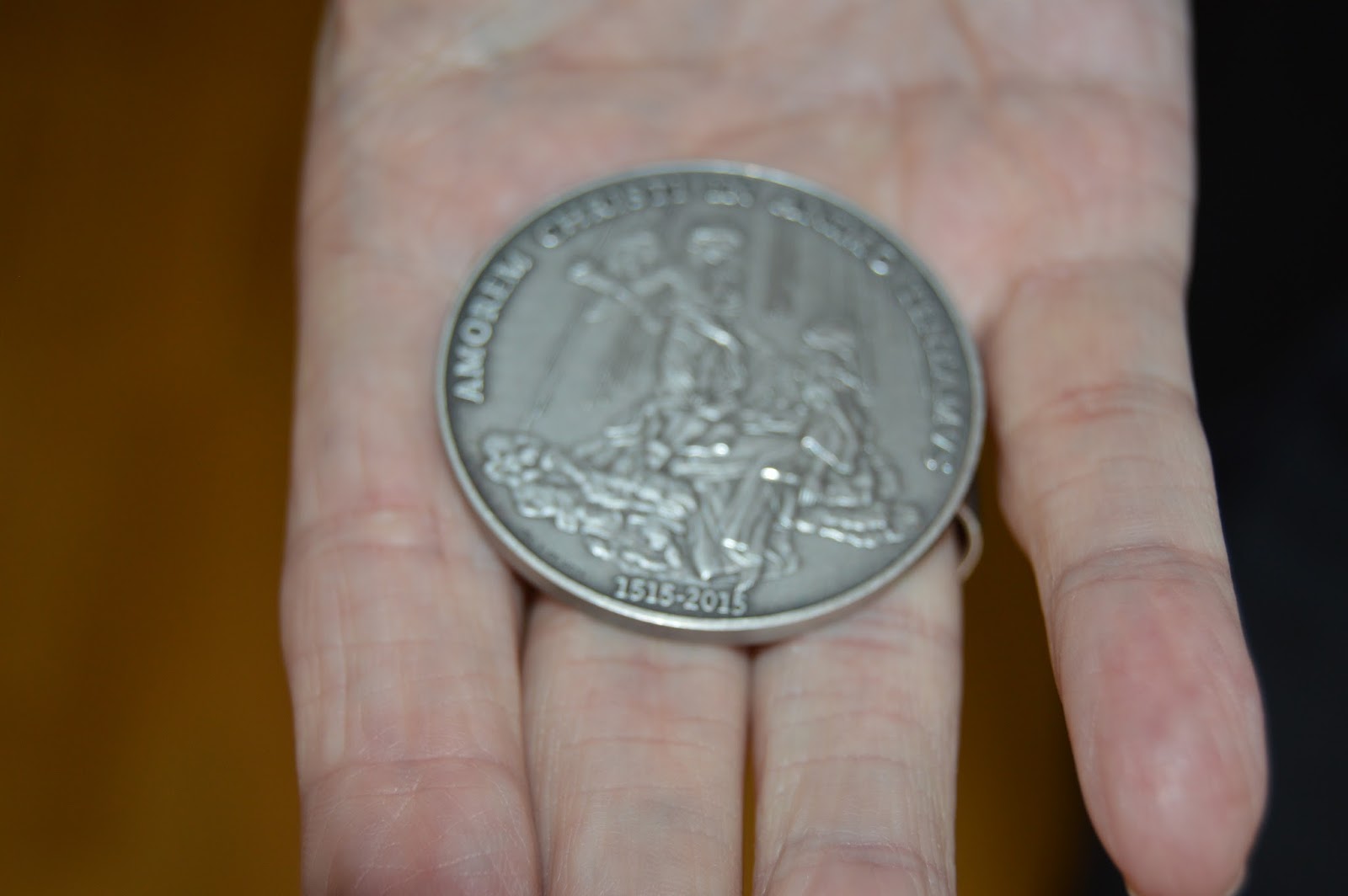Al cumplirse en ese mes de abril el tercer año del Pontificado del Papa Francisco, se acuñaba la moneda conmemorativa de esta efeméride. Por expreso deseo del Papa, el reverso de la medalla conmemorativa de su tercer año de Pontificado no lleva, como era costumbre, el rostro del Pontífice, sino la imagen de Santa Teresa de Jesús, primera mujer Doctora de la Iglesia. En concreto, se trata de una reproducción del “Éxtasis de Santa Teresa”, obra de Bernini. Una iniciativa que demuestra la particular cercanía del Papa Francisco por el nacimiento de la Santa abulense, en ocasión del V centenario de su nacimiento que celebrábamos justo un año antes. El Obispo de Ávila, Mons. Jesús García Burillo, mostraba en este día dicha moneda, que aviva el recuerdo de un año singularmente especial para nuestra diócesis.