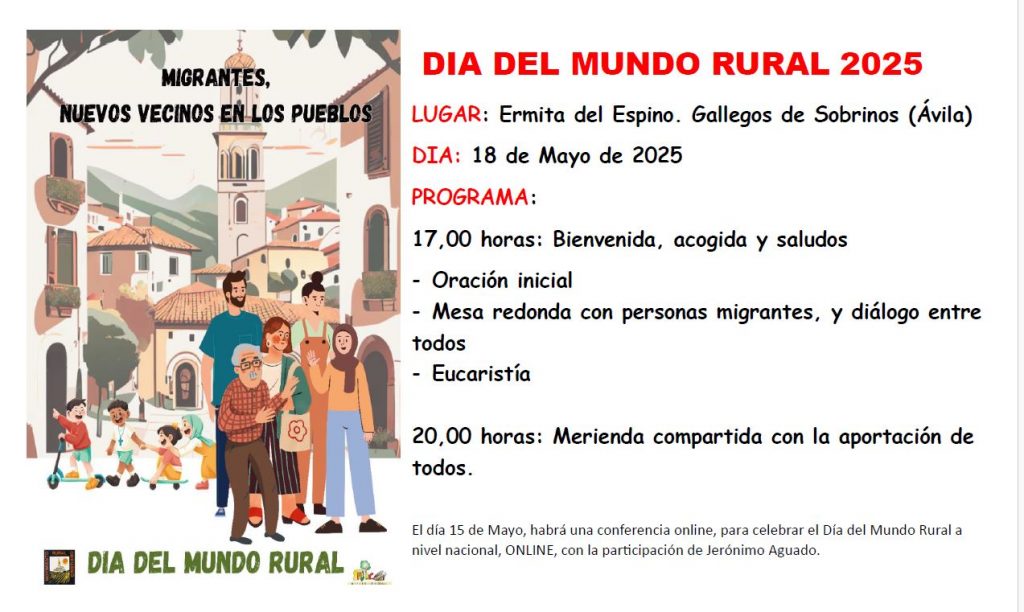 En nuestra diócesis, este año el Día del Mundo Rural traslada su celebración a la ermita de Nuestra Señora del Espino, en Gallegos de Sobrinos este próximo domingo 18 de mayo. Comenzará con una mesa redonda con personas migrantes, para concluir con la Eucaristía y una merienda compartida.