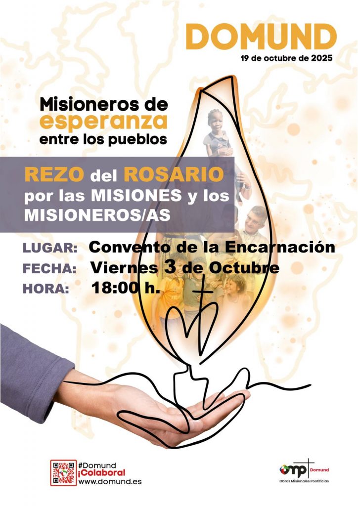Por ello, aunque aún falten algunas semanas para el DOMUND, desde ya la Delegación diocesana de Misiones ha organizado diversas celebraciones y actividades para vivir este tiempo con intensidad misionera. La primera de ellas será este viernes, 3 de octubre, en el convento de La Encarnación, donde nos uniremos en el rezo del Rosario por las Misiones y los misioneros.