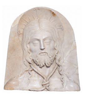 Se trata, por un lado, del Ecce Homo realizado por Vasco de la Zarza, y que pertenece a la S.A.I. Catedral del Salvador. Habitualmente se puede encontrar en el museo catedralicio, concretamente en la llamada Sala de la Pasión, situada junto a la de cantorales. Esta obra, realizada por entero en alabastro, muestra la cara y el torso de Cristo semidesnudo, con una expresión serena. La soga al cuello nos indica que hace referencia al momento en el que, tras ser azotado y coronado de espinas, Pilatos le muestra ante el pueblo judío con la expresión que da nombre a la obra: “Ecce homo” (“he aquí al hombre”). En la muestra de Las Edades lo encontraremos en la sede de la iglesia de San Cipriano.