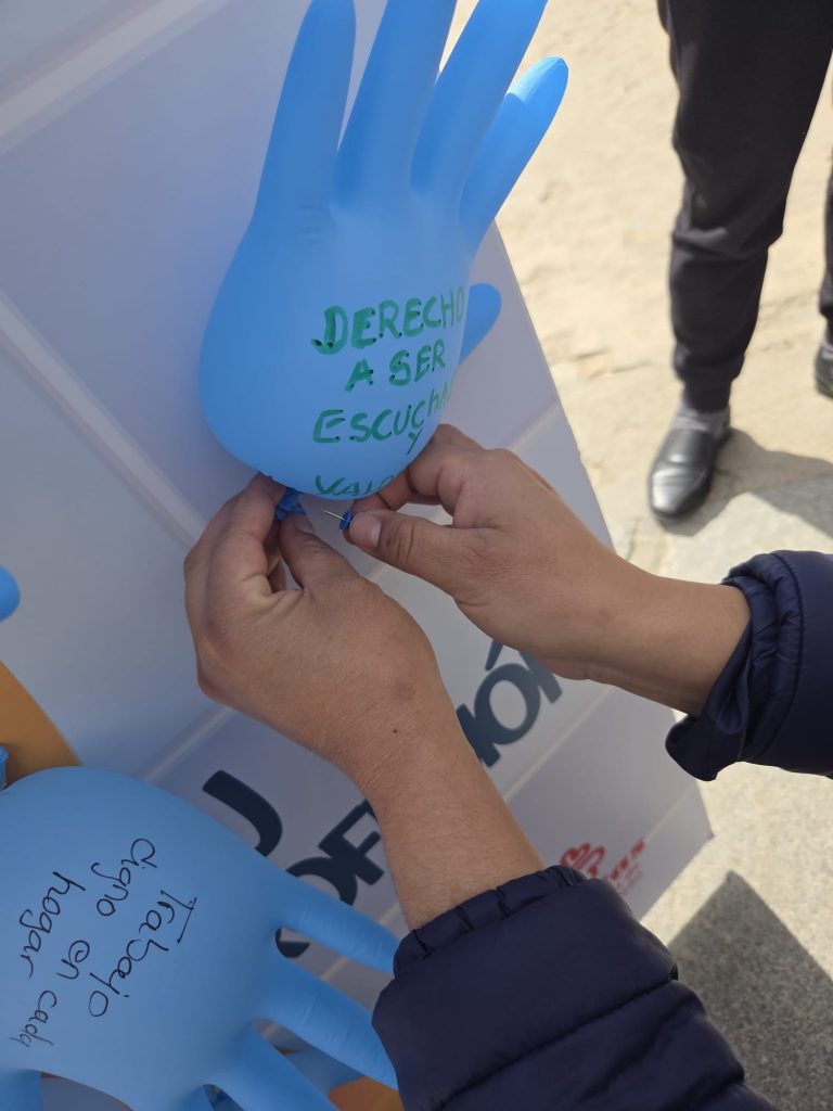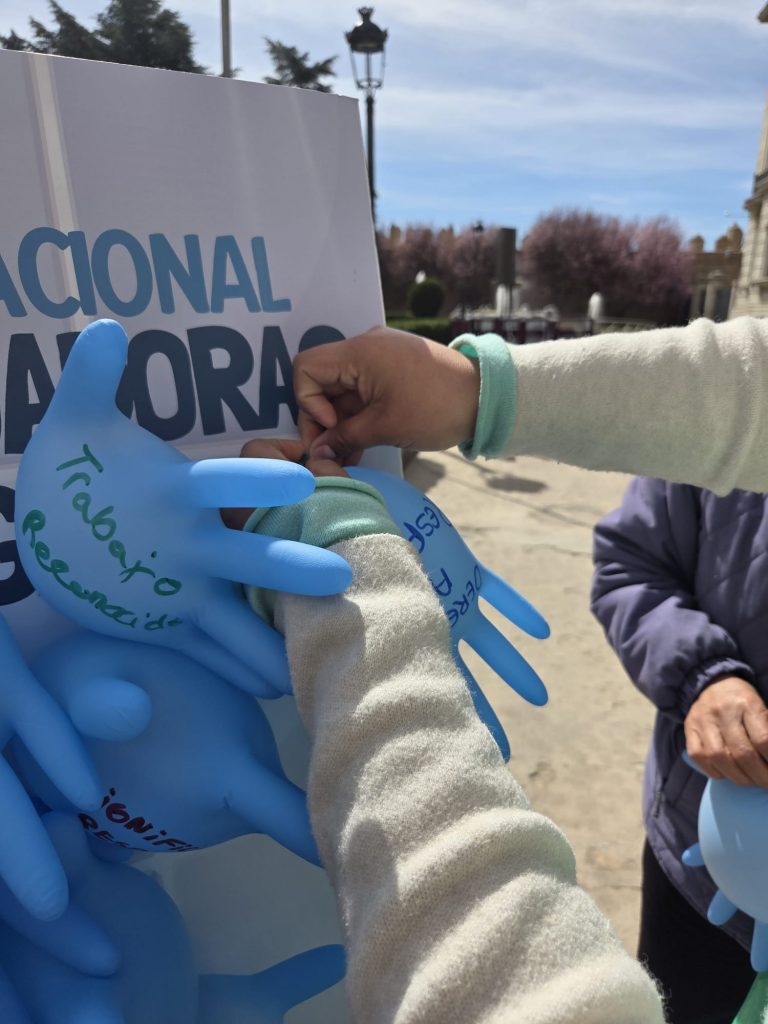 La iniciativa ha combinado la lectura de un manifiesto con un gesto simbólico: la colocación de guantes hinchados en un panel donde los participantes han podido escribir sus reivindicaciones. Mensajes como “Tenemos derechos, falta respeto”, “Seguridad social plena, sin excepciones” o “Igualdad de derechos con el resto de trabajadores” han puesto voz a las principales demandas del sector, resumidas en el lema “Tu hogar, su profesión”.