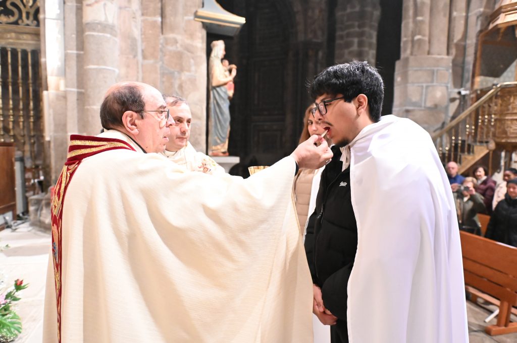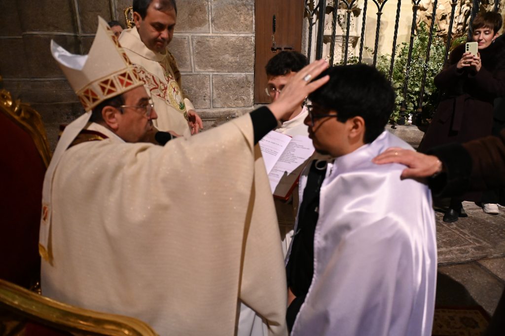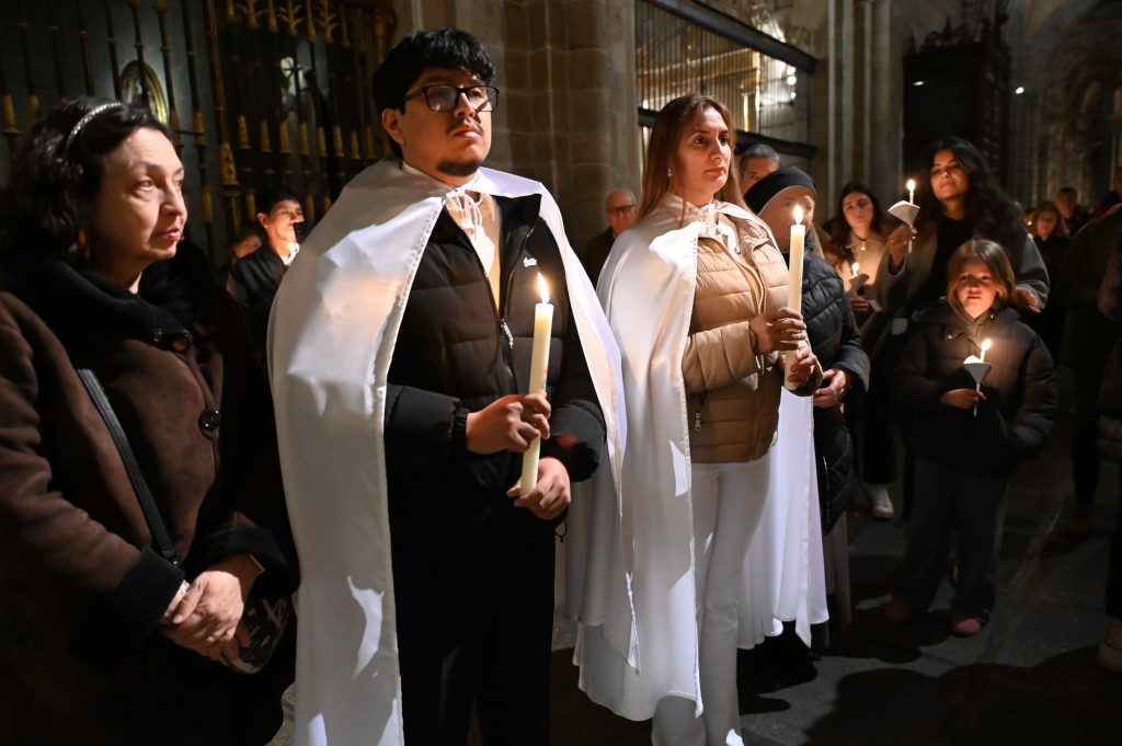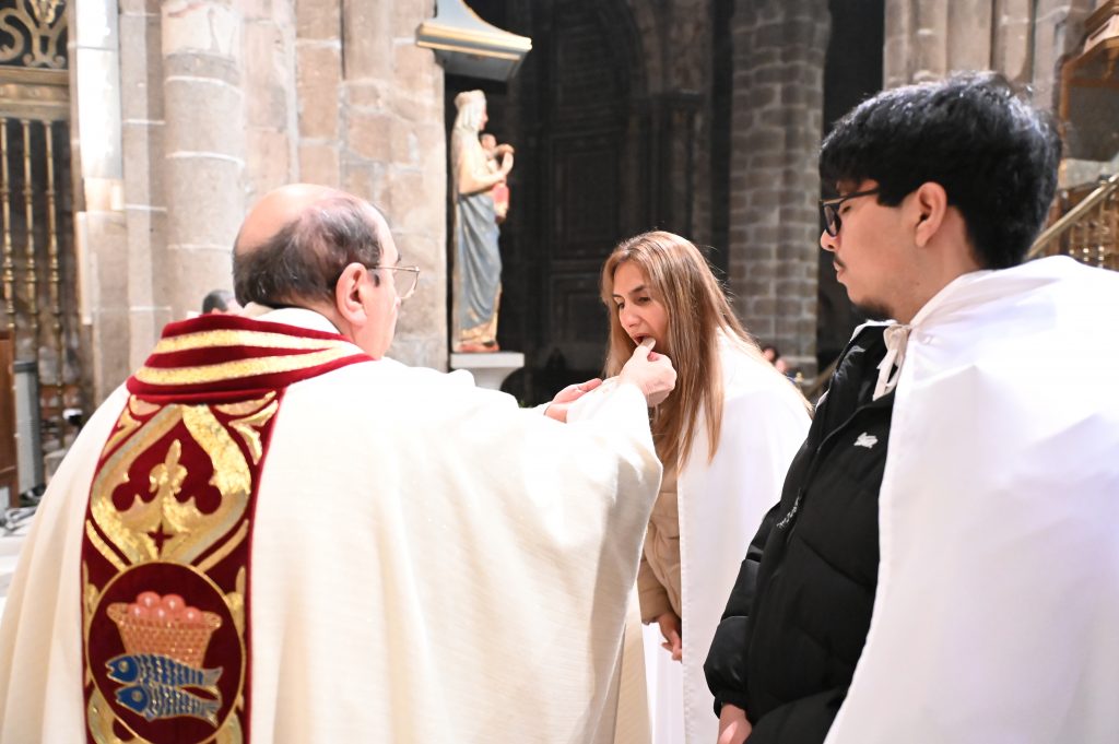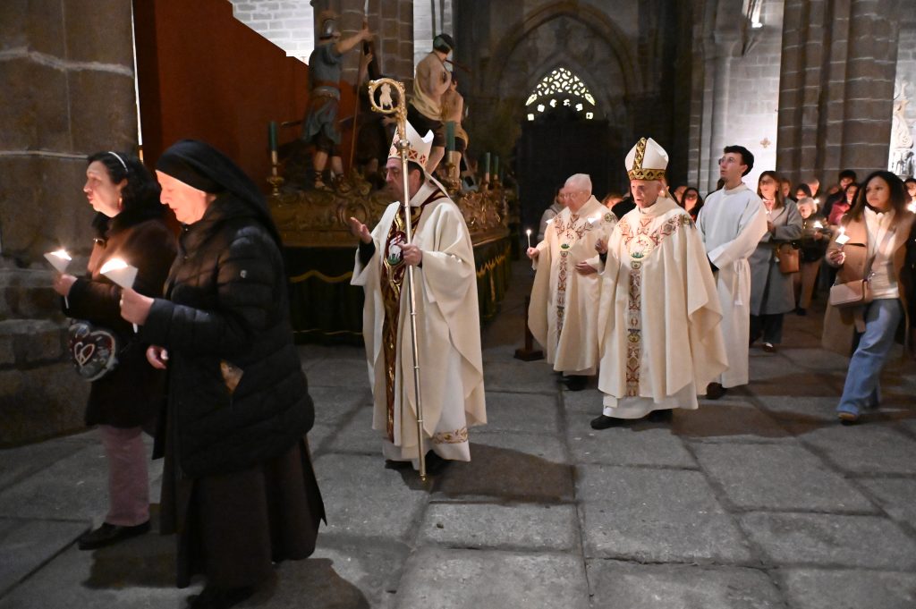 Tras la homilía, uno de los momentos más significativos de la celebración fue la liturgia bautismal. Los fieles, con sus velas encendidas, peregrinaron hasta el baptisterio de la catedral, donde se encuentra la pila bautismal tallada por Vasco de la Zarza. Allí, dos adultos, Giuseppe y Dayana, recibieron los sacramentos de la iniciación cristiana: fueron bautizados, confirmados por el propio obispo y participaron por primera vez en la Eucaristía, incorporándose plenamente a la Iglesia.