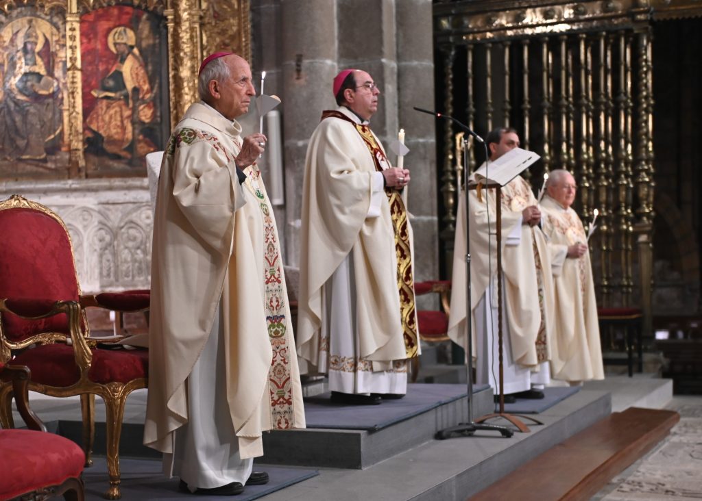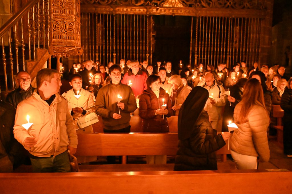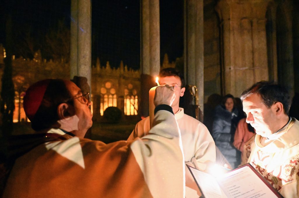 La celebración comenzó en el claustro, en un ambiente de silencio y oscuridad, con la bendición del fuego. Allí, el obispo de Ávila, Mons. Jesús Rico García, prendió el cirio pascual, signo de Cristo, luz del mundo. A continuación, se inició la procesión hacia el interior del templo, todavía en penumbra, donde la simbología de la luz y las tinieblas marcó toda la celebración. Una vez colocado el cirio en su lugar, la luz inundó la catedral, evocando que Cristo viene a iluminar todas las tinieblas.
