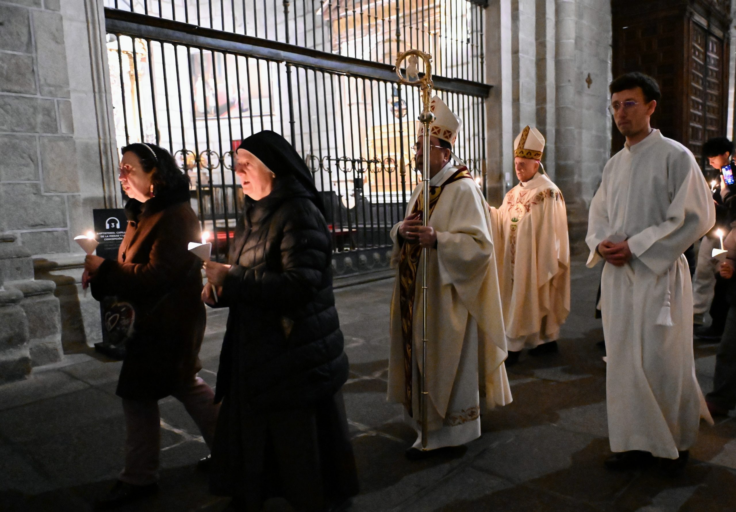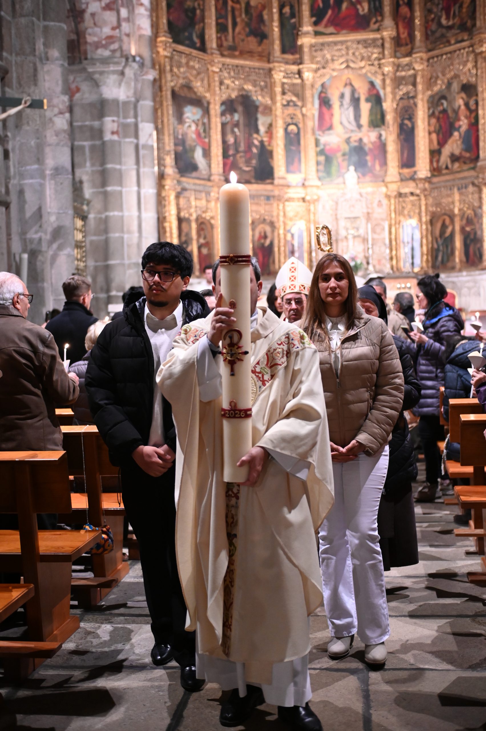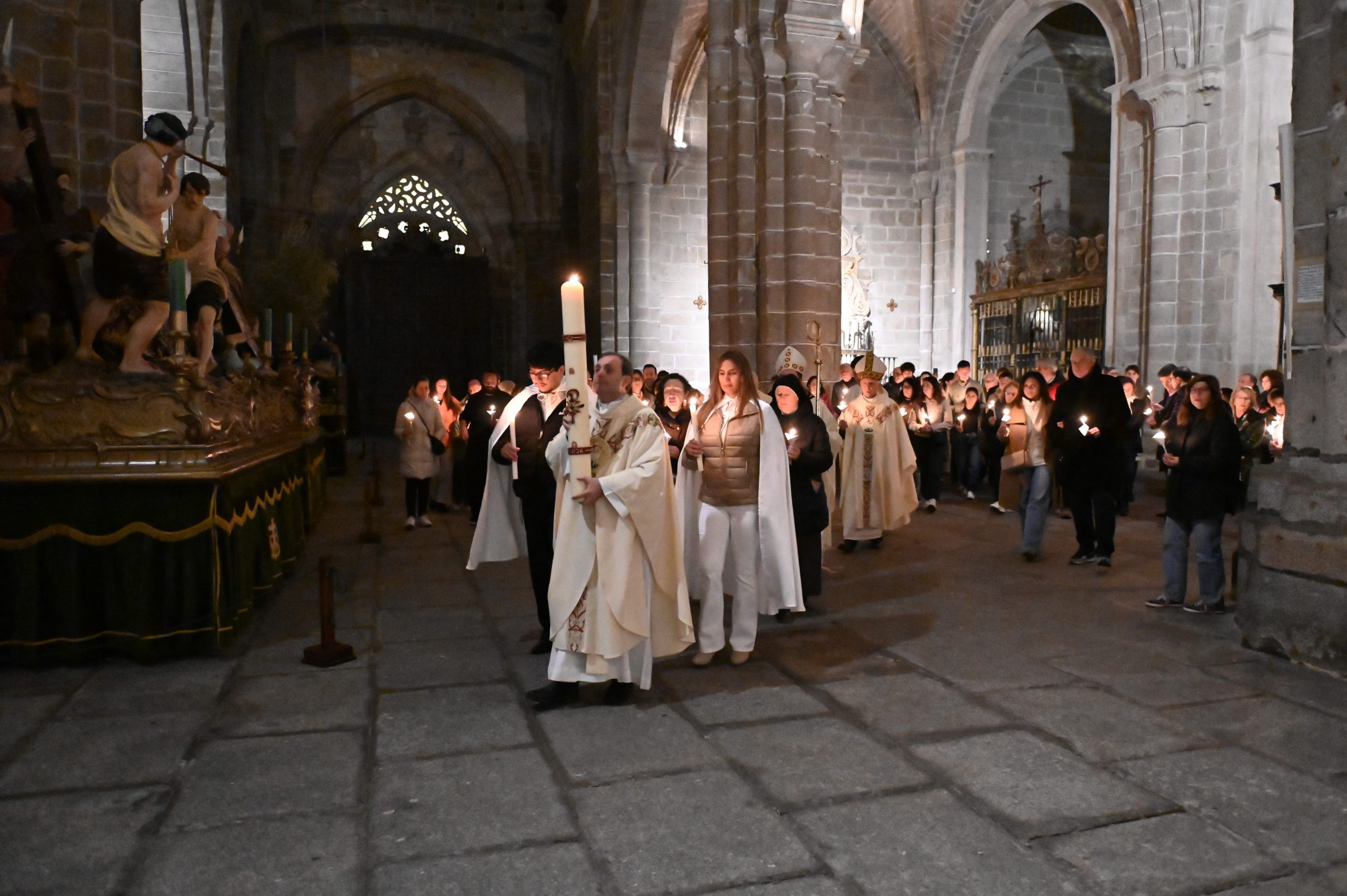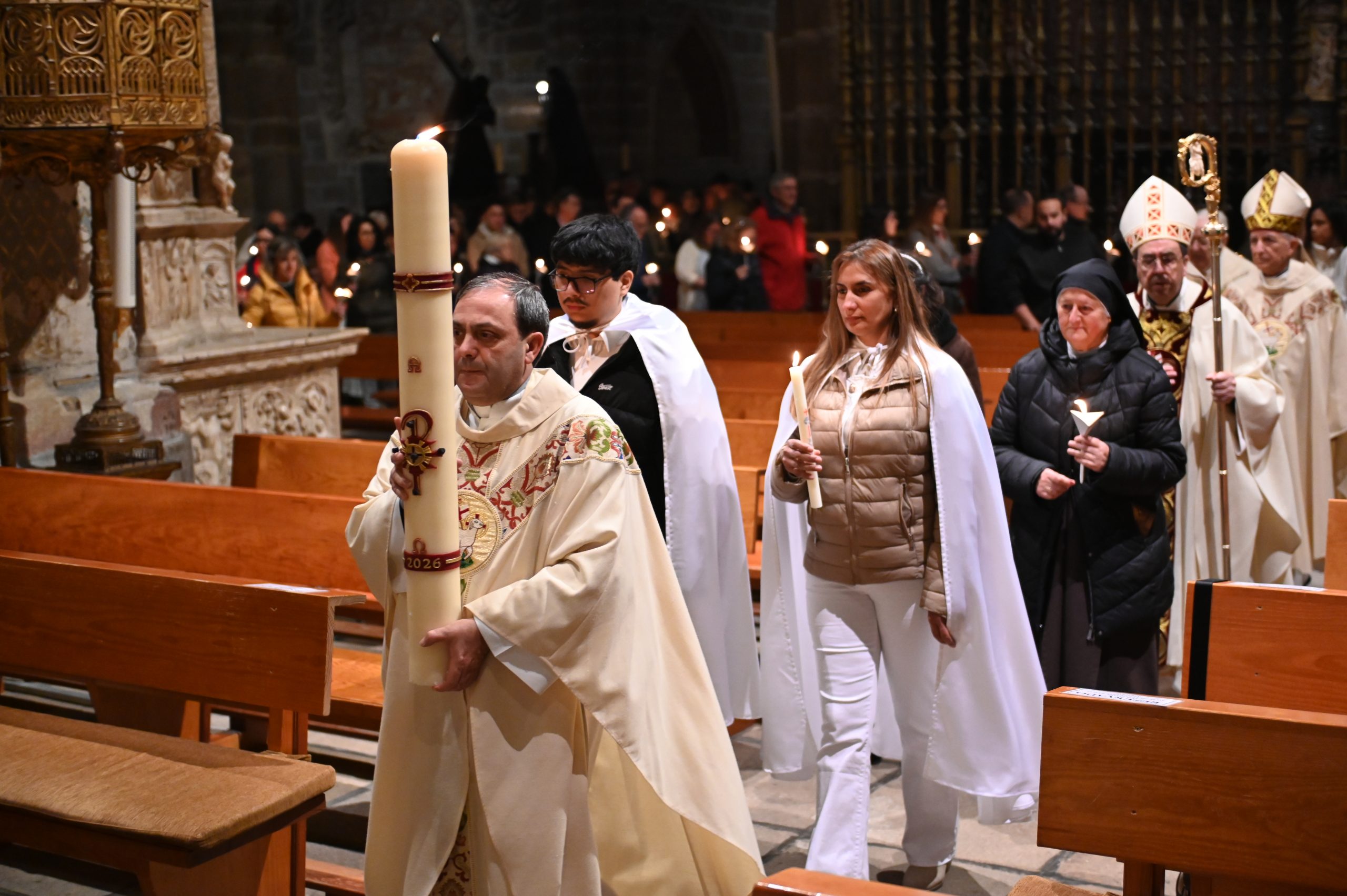 La celebración comenzó en el claustro, en un ambiente de silencio y oscuridad, con la bendición del fuego. Allí, el obispo de Ávila, Mons. Jesús Rico García, prendió el cirio pascual, signo de Cristo, luz del mundo. A continuación, se inició la procesión hacia el interior del templo, todavía en penumbra, donde la simbología de la luz y las tinieblas marcó toda la celebración. Una vez colocado el cirio en su lugar, la luz inundó la catedral, evocando que Cristo viene a iluminar todas las tinieblas.