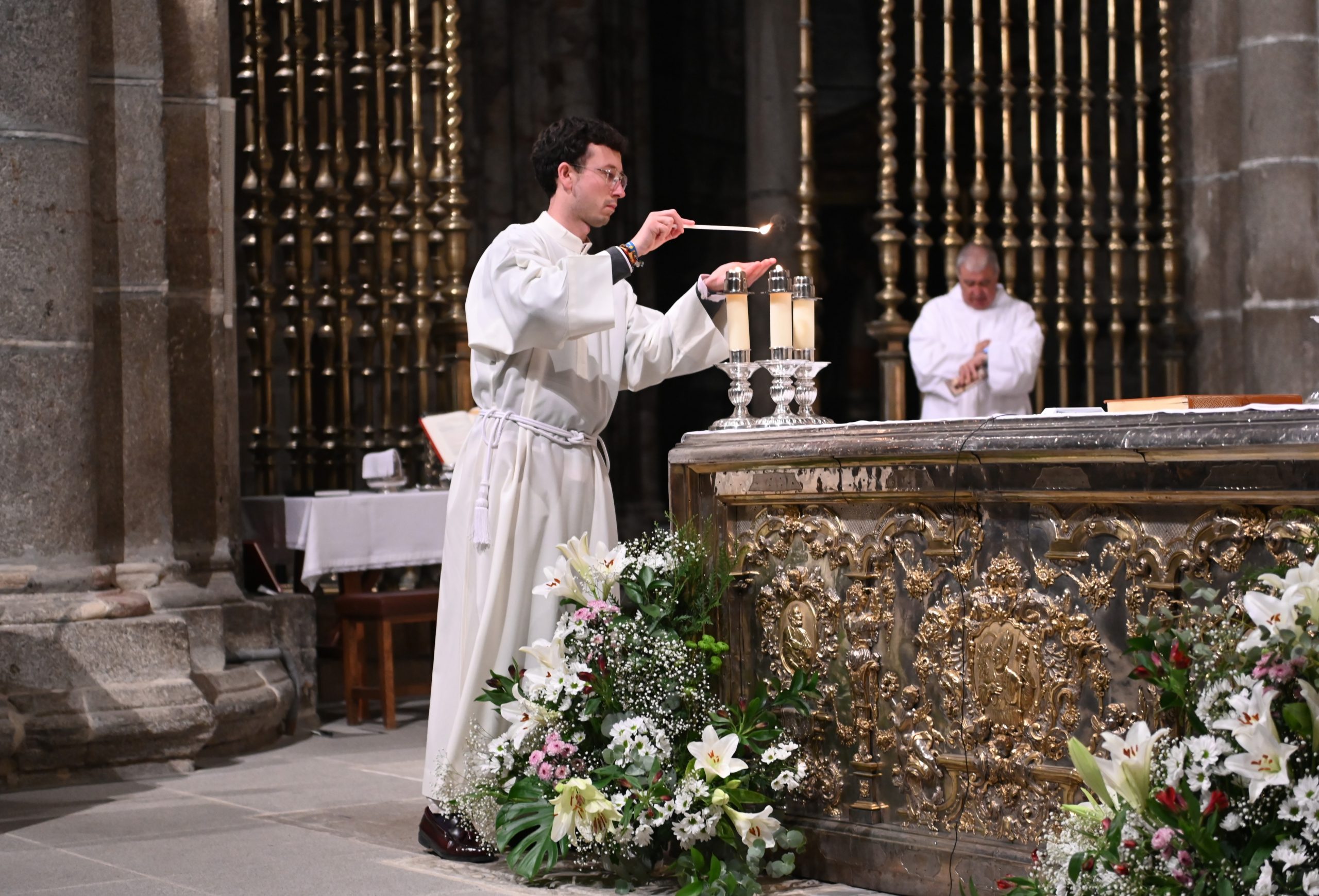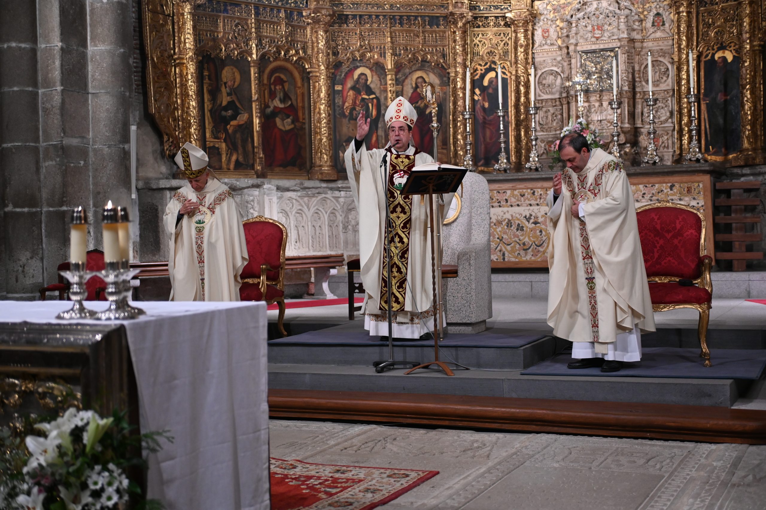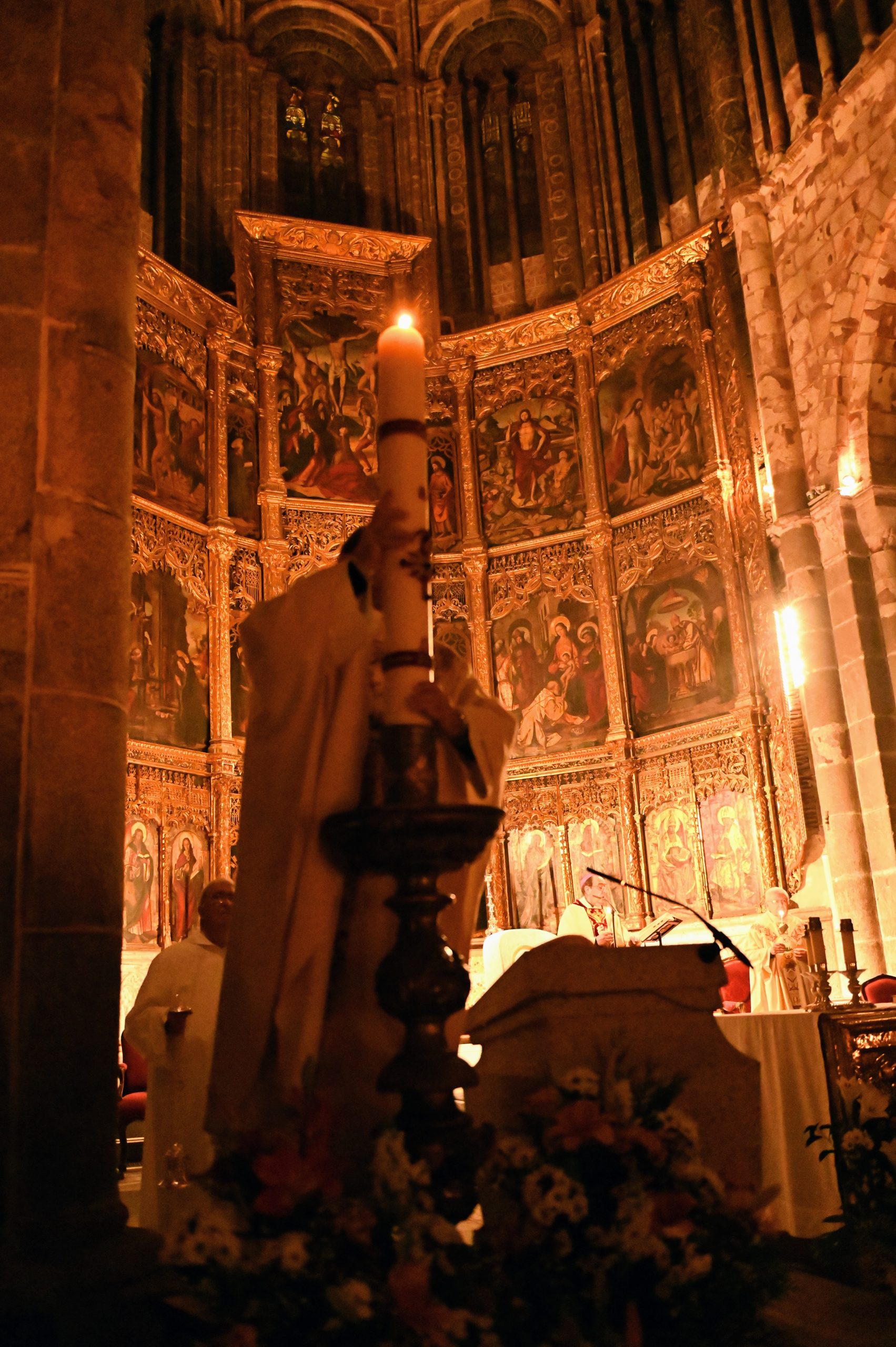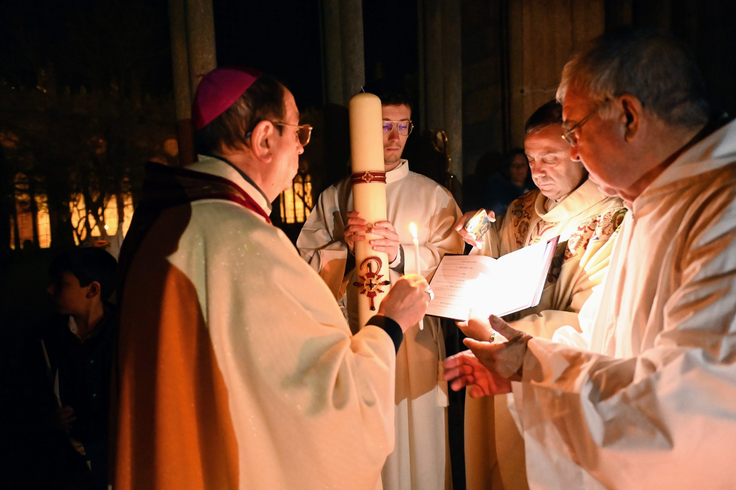 La celebración comenzó en el claustro, en un ambiente de silencio y oscuridad, con la bendición del fuego. Allí, el obispo de Ávila, Mons. Jesús Rico García, prendió el cirio pascual, signo de Cristo, luz del mundo. A continuación, se inició la procesión hacia el interior del templo, todavía en penumbra, donde la simbología de la luz y las tinieblas marcó toda la celebración. Una vez colocado el cirio en su lugar, la luz inundó la catedral, evocando que Cristo viene a iluminar todas las tinieblas.