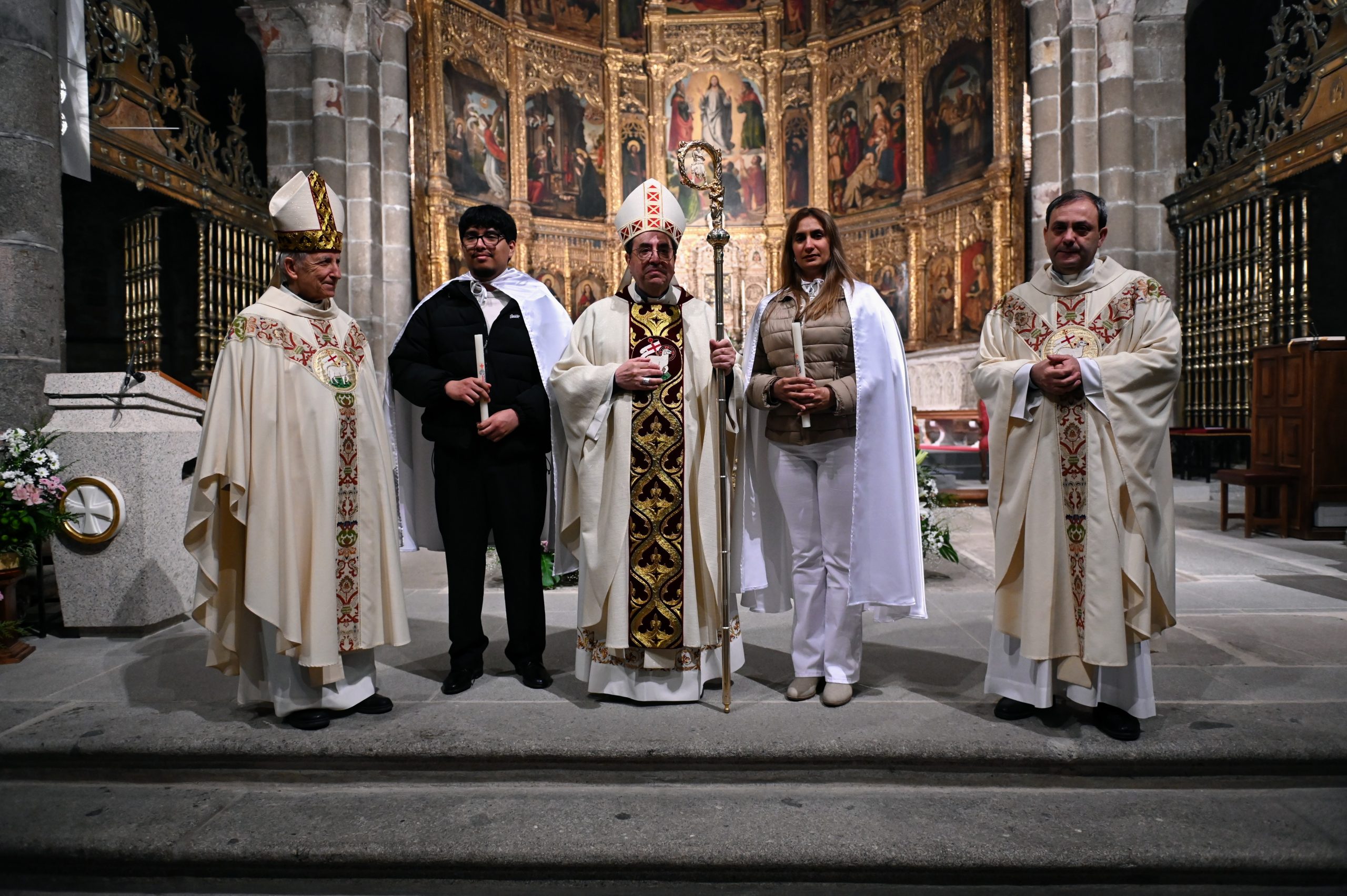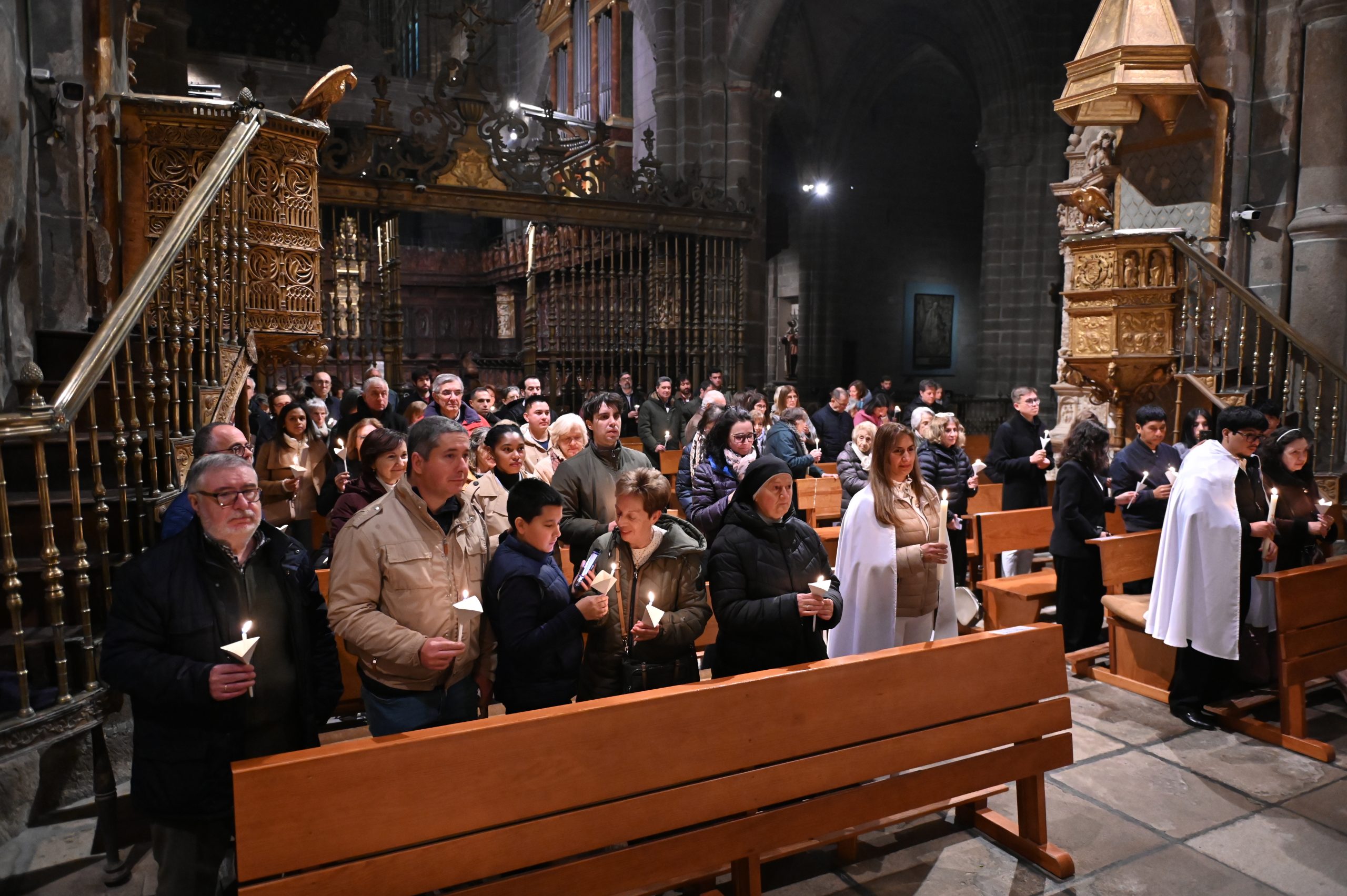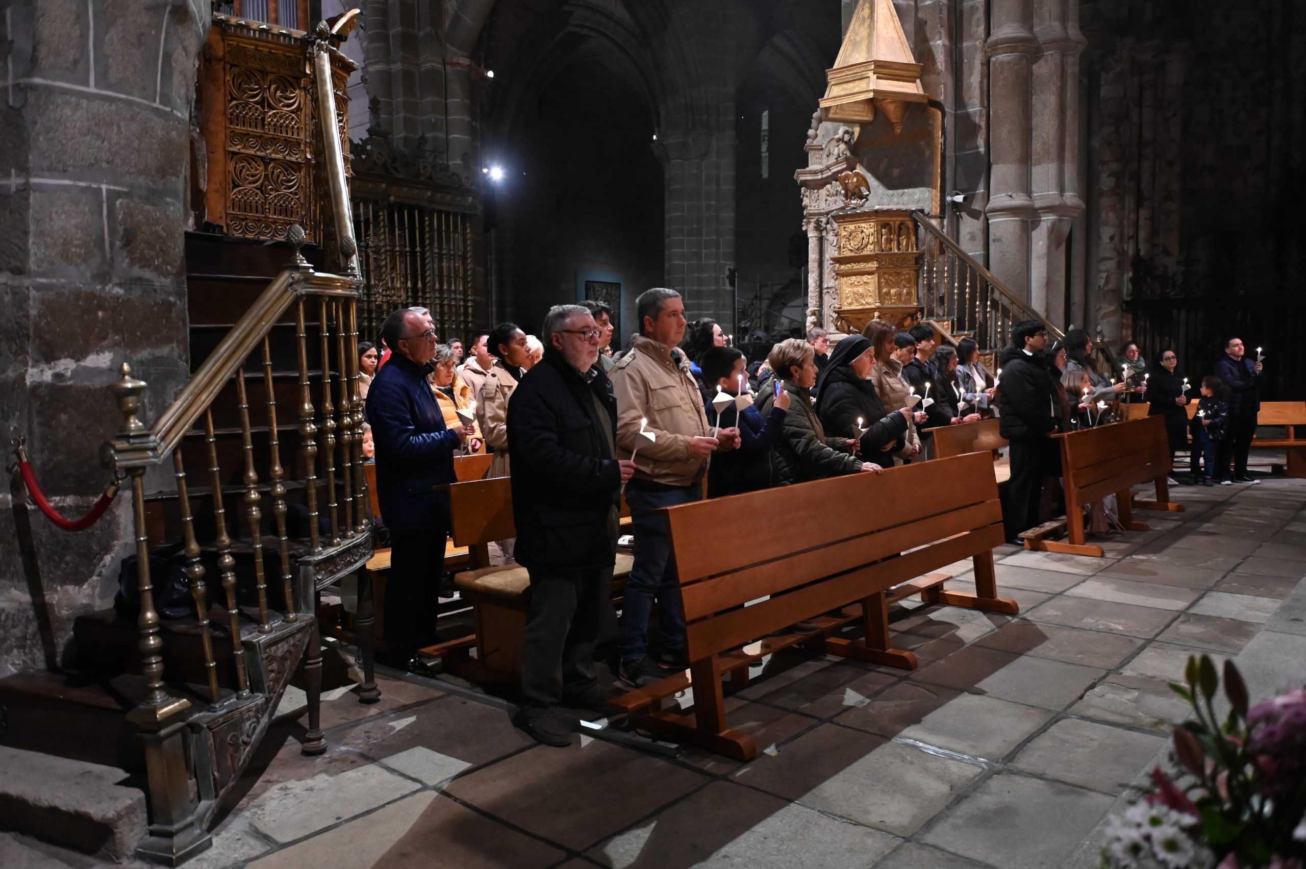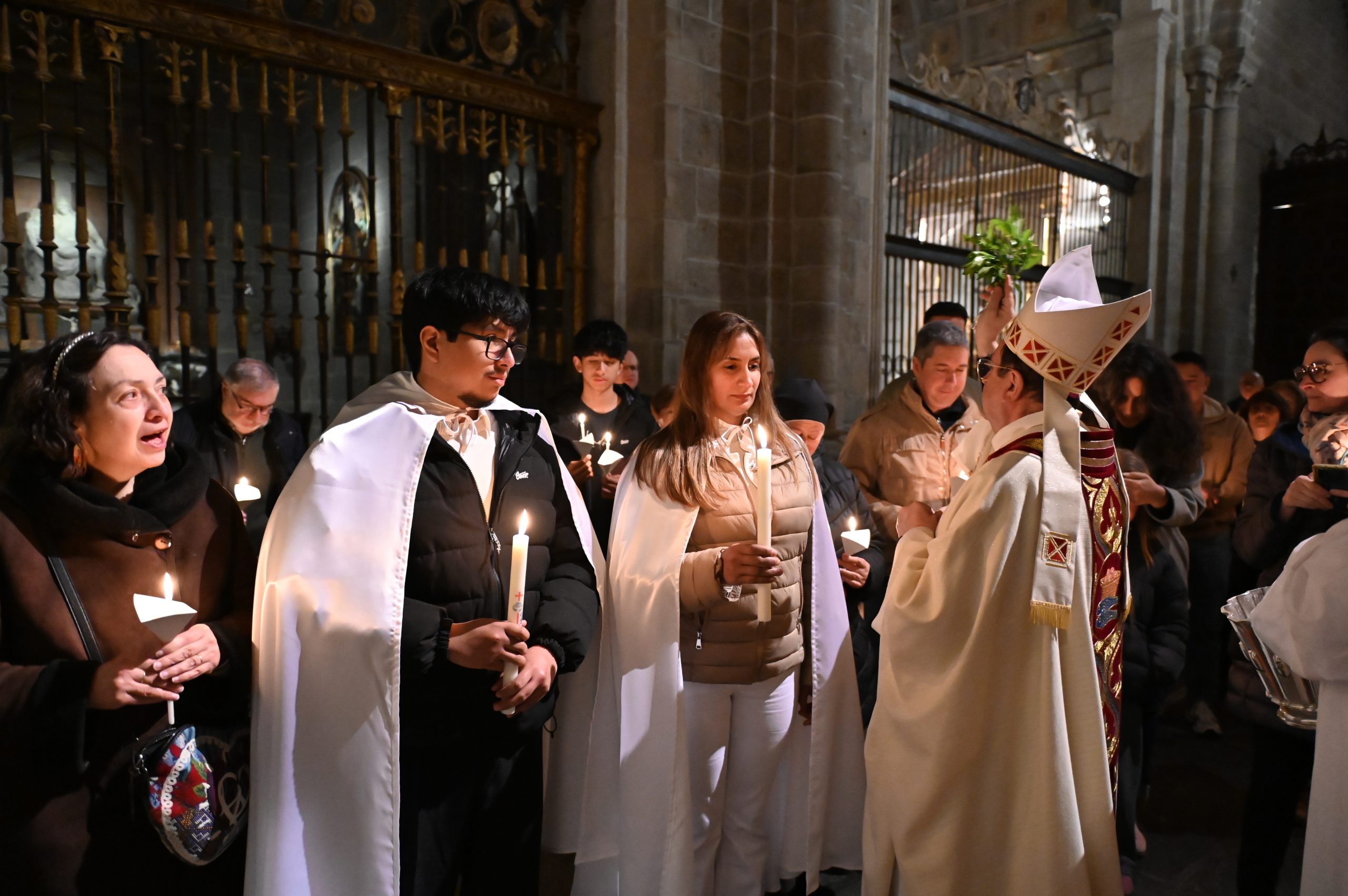 Tras la homilía, uno de los momentos más significativos de la celebración fue la liturgia bautismal. Los fieles, con sus velas encendidas, peregrinaron hasta el baptisterio de la catedral, donde se encuentra la pila bautismal tallada por Vasco de la Zarza. Allí, dos adultos, Giuseppe y Dayana, recibieron los sacramentos de la iniciación cristiana: fueron bautizados, confirmados por el propio obispo y participaron por primera vez en la Eucaristía, incorporándose plenamente a la Iglesia.