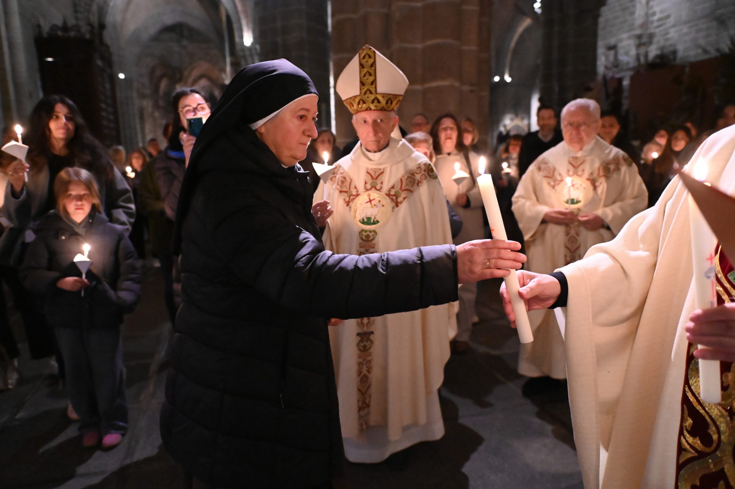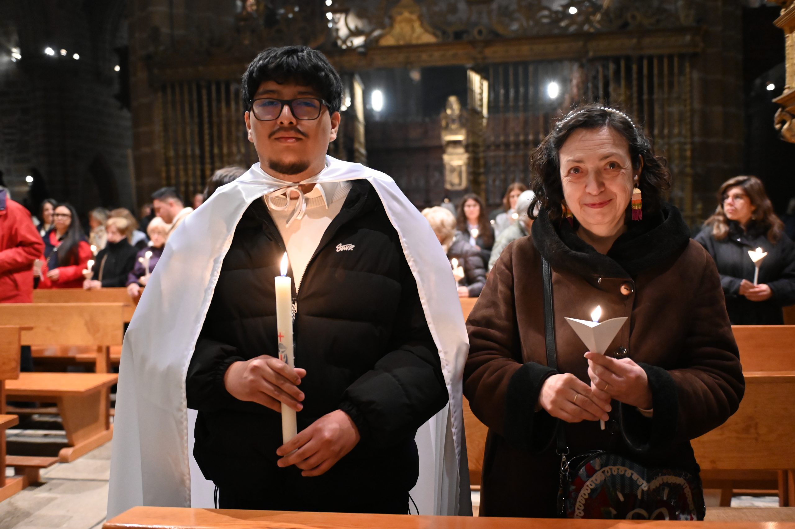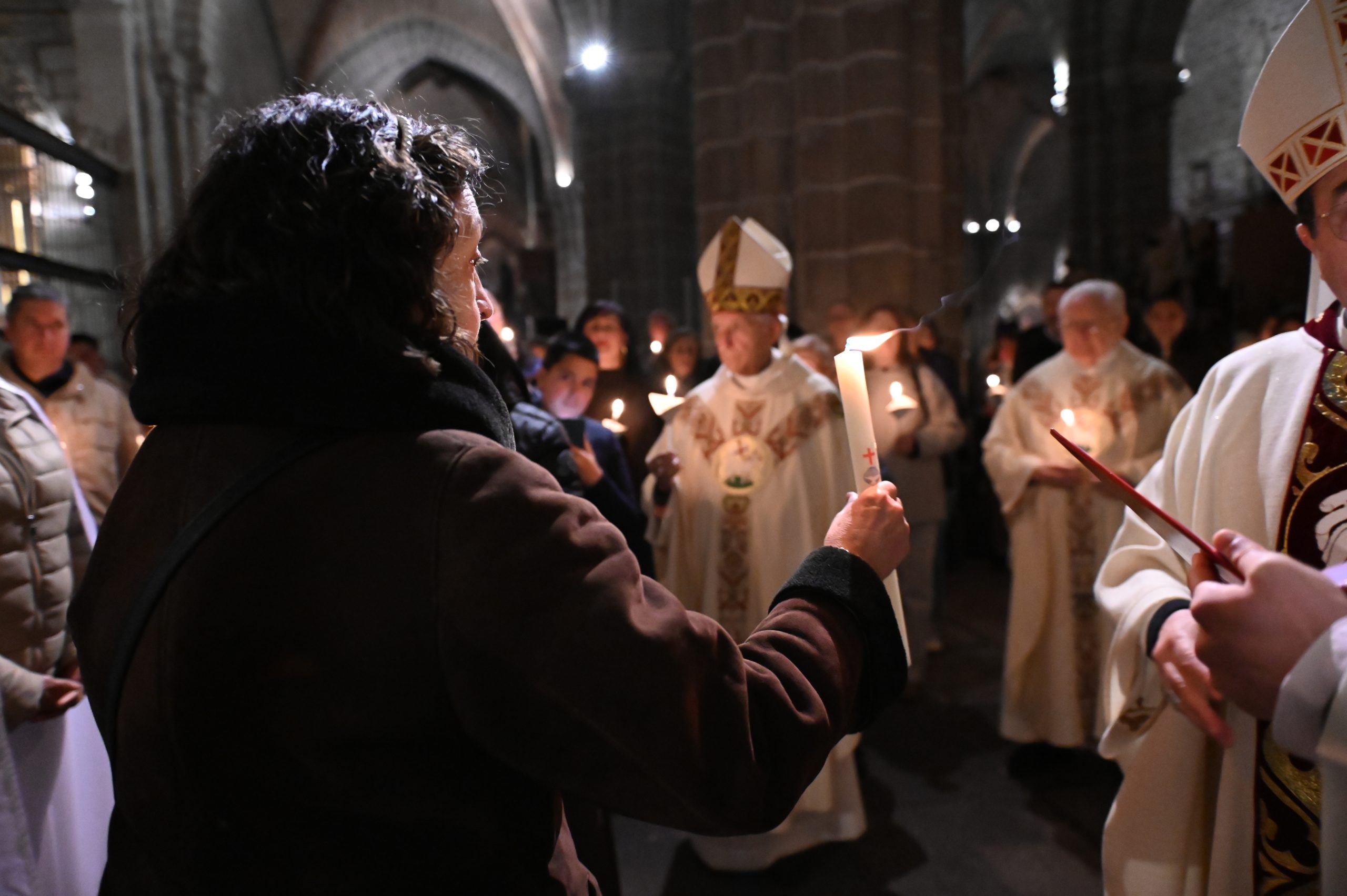Tras la homilía, uno de los momentos más significativos de la celebración fue la liturgia bautismal. Los fieles, con sus velas encendidas, peregrinaron hasta el baptisterio de la catedral, donde se encuentra la pila bautismal tallada por Vasco de la Zarza. Allí, dos adultos, Giuseppe y Dayana, recibieron los sacramentos de la iniciación cristiana: fueron bautizados, confirmados por el propio obispo y participaron por primera vez en la Eucaristía, incorporándose plenamente a la Iglesia.