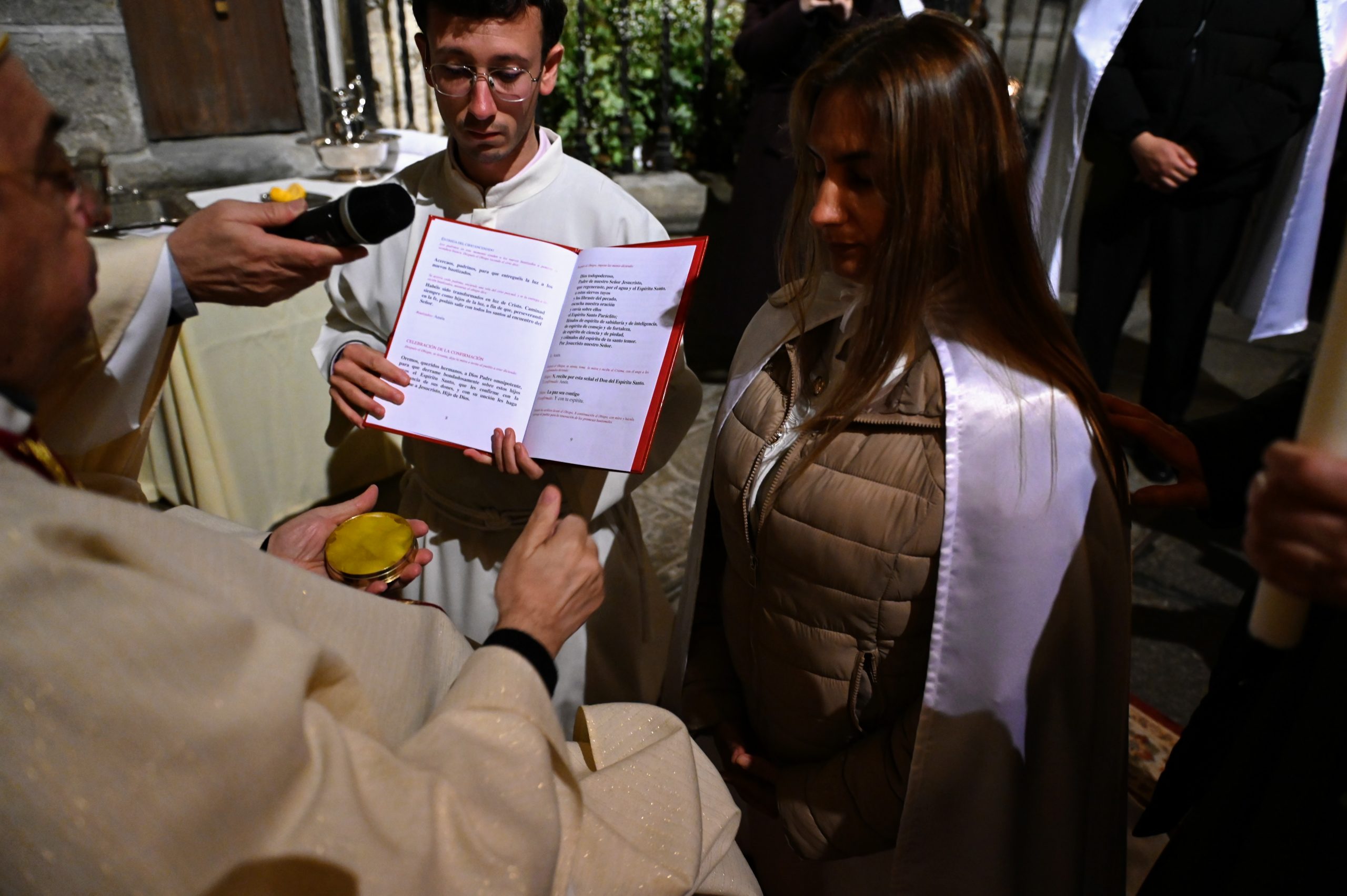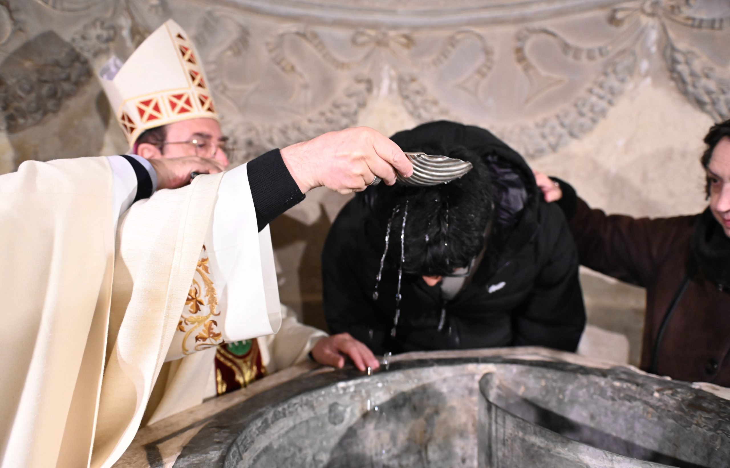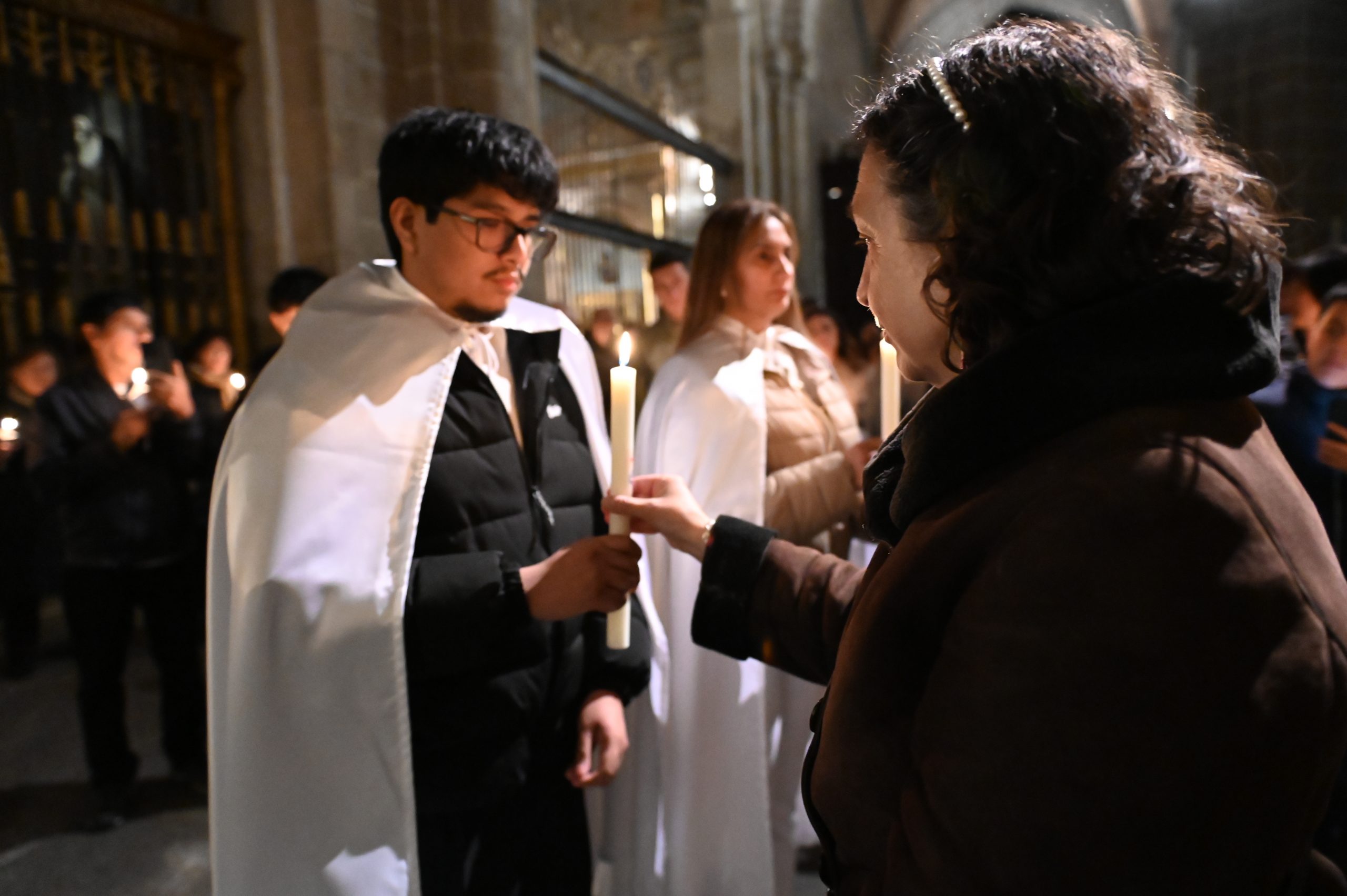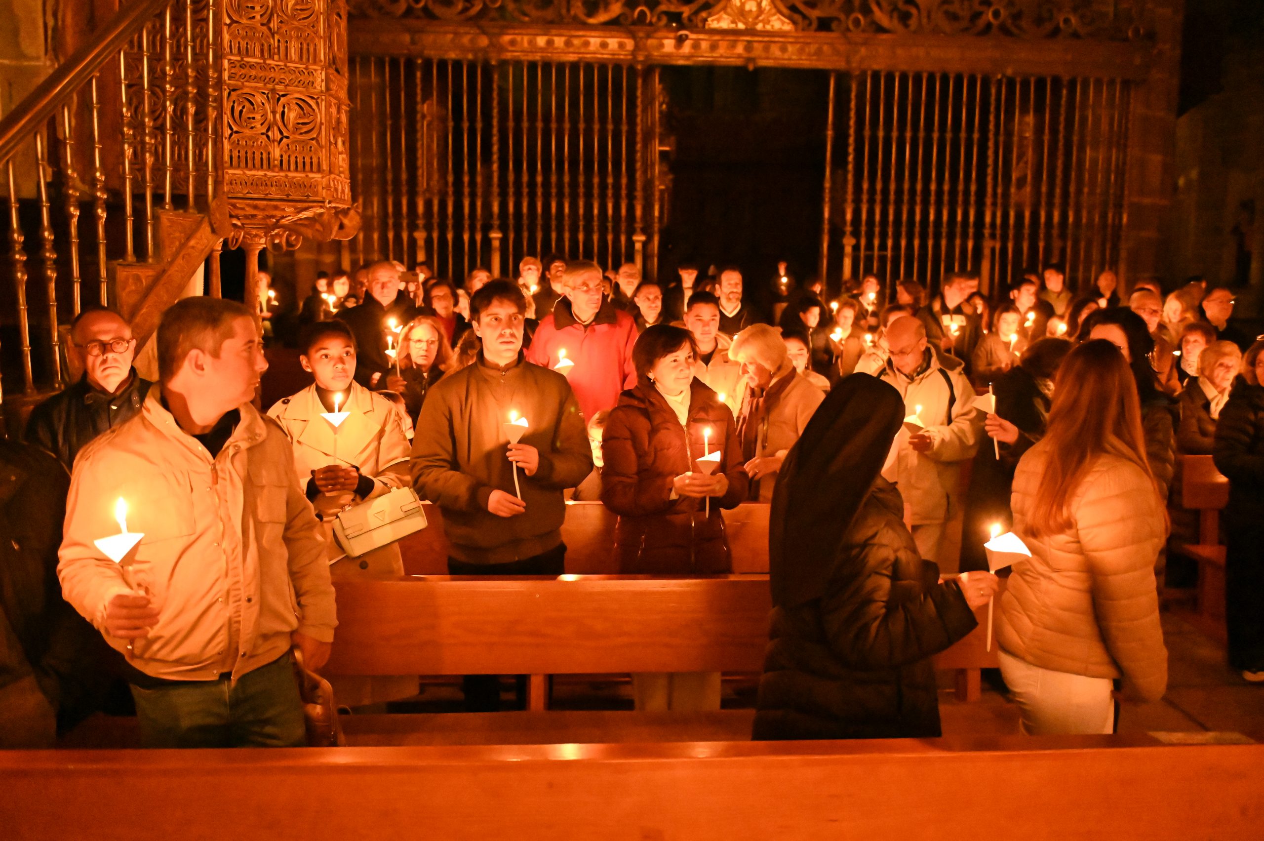 Tras la homilía, uno de los momentos más significativos de la celebración fue la liturgia bautismal. Los fieles, con sus velas encendidas, peregrinaron hasta el baptisterio de la catedral, donde se encuentra la pila bautismal tallada por Vasco de la Zarza. Allí, dos adultos, Giuseppe y Dayana, recibieron los sacramentos de la iniciación cristiana: fueron bautizados, confirmados por el propio obispo y participaron por primera vez en la Eucaristía, incorporándose plenamente a la Iglesia.