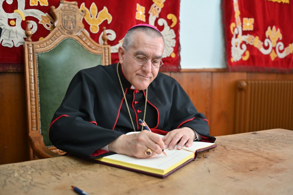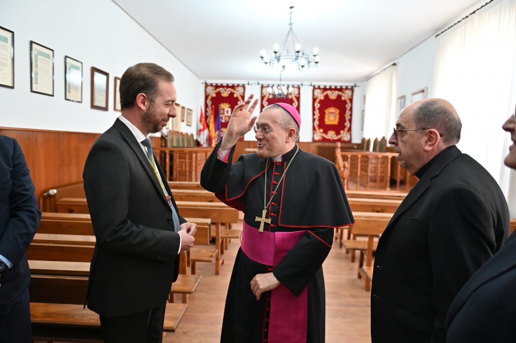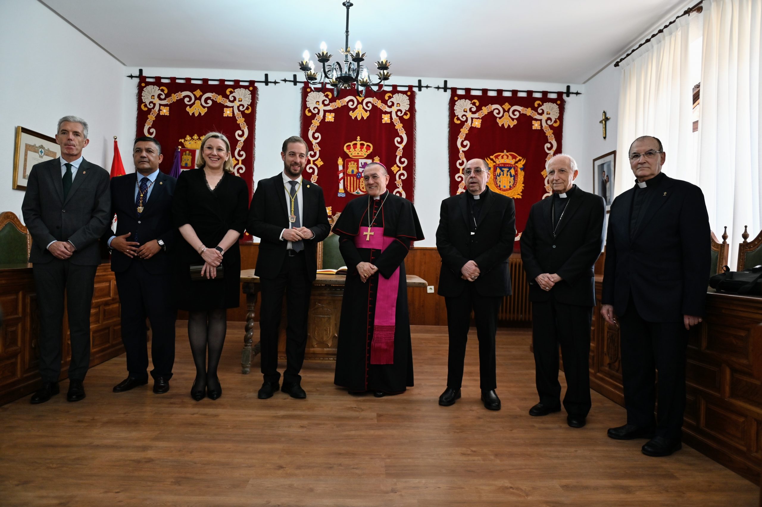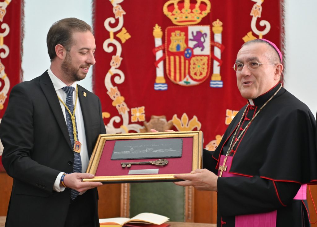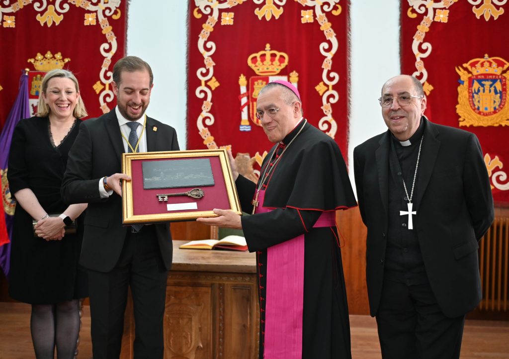 La jornada comenzó en el salón de plenos del Ayuntamiento, donde el alcalde de la localidad, Jesús del Campo, entregó al Nuncio las llaves de la villa. Piero Pioppo agradeció el gesto besando «esta tierra en signo de gratitud» y calificó de «honor» su participación en unos actos que, dijo, «unen a Europa con el Nuevo Mundo».