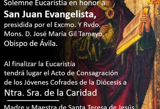 El próximo sábado, 7 de noviembre, celebraremos la fiesta de San Juan Evangelista, patrono de los jóvenes cofrades. Con este motivo, la Catedral de Ávila acogerá una Eucaristía presidida por nuestro obispo D. José María, tras la cual los jóvenes serán consagrados a la Virgen de la Caridad como Patrona de la Juventud Cofrade de […]